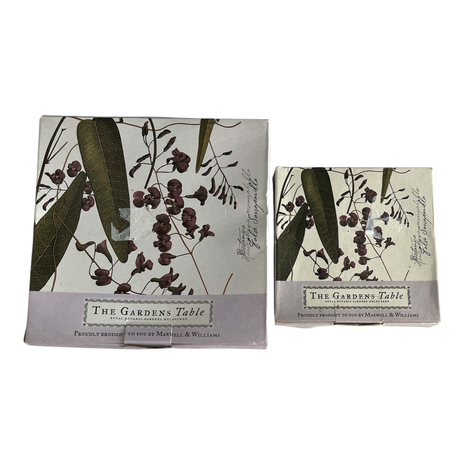 Set of two Maxwell & Williams fine bone china plates from *The Gardens Table* collection, featuring the “False Sarsaparilla” floral design. Inspired by artwork from the archives of the Royal Botanic Gardens in Melbourne, this design showcases deep purple blossoms, green leaves, and script accents for a refined botanical look. A beautiful addition for collectors or for serving small treats with style.