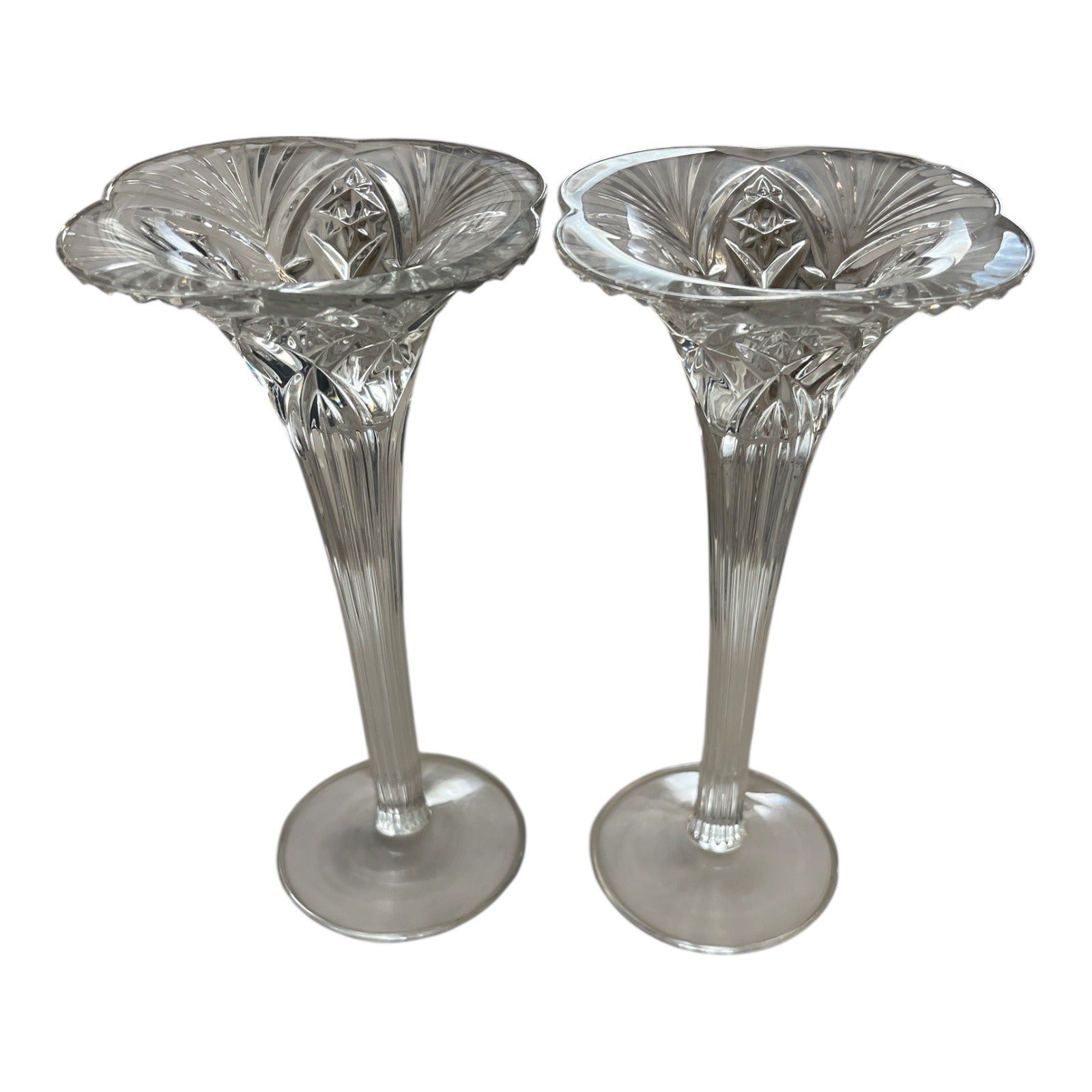 Beautiful pair of vintage Vincennes crystal candlesticks, made in France. These elegant glass candle holders feature a classic faceted stem and wide, stable base. Perfect for weddings, formal dining, or as a timeless collectible display.