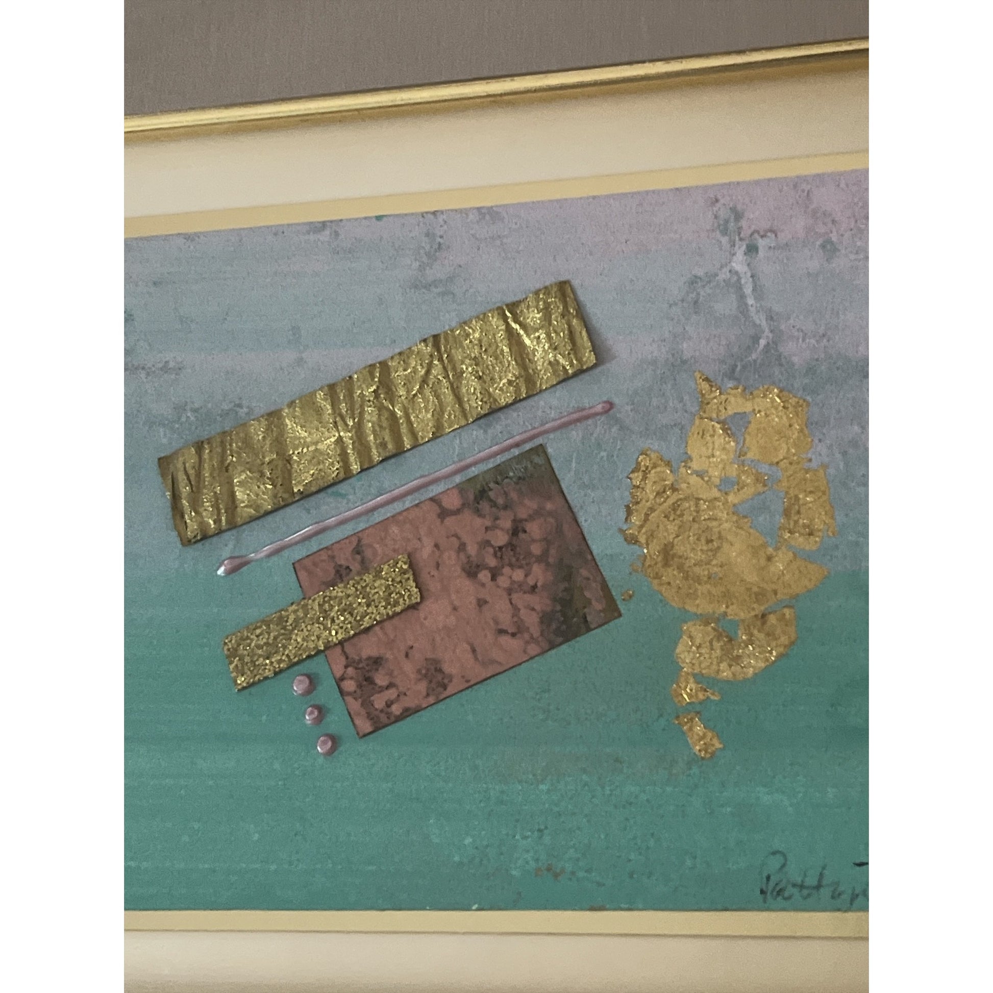 This original mixed-media artwork by Merri Pattinian, titled *Teal Charisma*, highlights her distinctive use of layered textures, metallic foils, and jewel-tone color palettes. Known for her bold collages in the 1980s–1990s, Pattinian’s works remain highly collectible and sought after in the decorative fine art market.