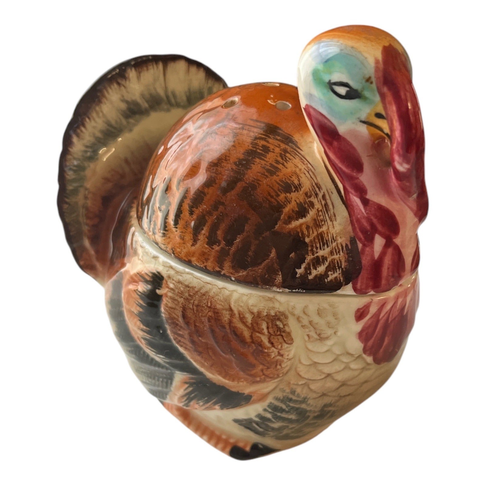 Add a festive touch to your kitchen with this charming turkey-shaped ceramic salt shaker, made in Japan. Featuring a beautifully detailed and colorful design, this shaker captures the essence of a turkey with vibrant hues of brown, red, green, and blue.