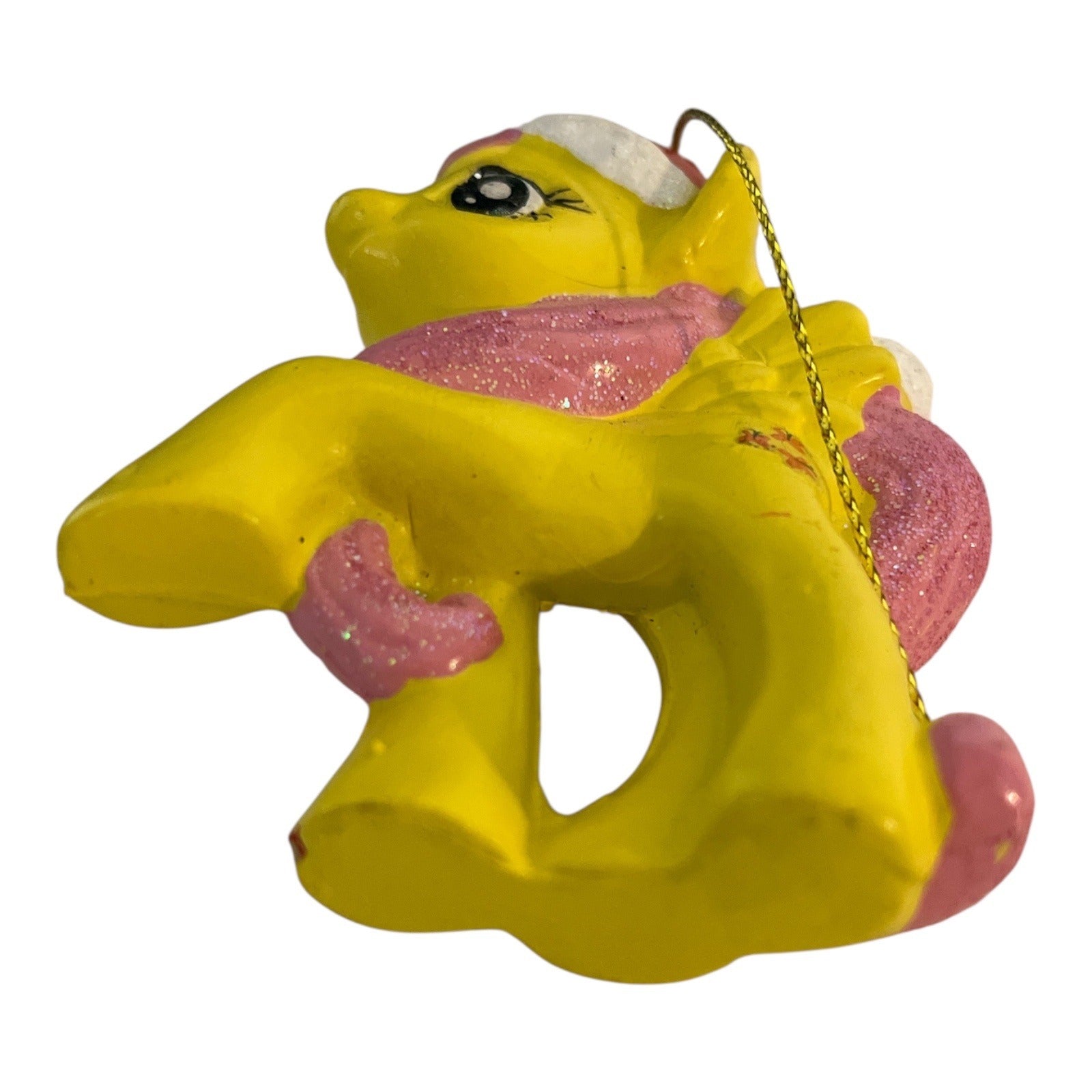 Add a touch of holiday magic with this My Little Pony Christmas ornament featuring **Fluttershy** in a glittery pink mane and festive red Santa hat. Made of painted resin with a gold hanging cord, it’s the perfect stocking stuffer or tree decoration for MLP fans.