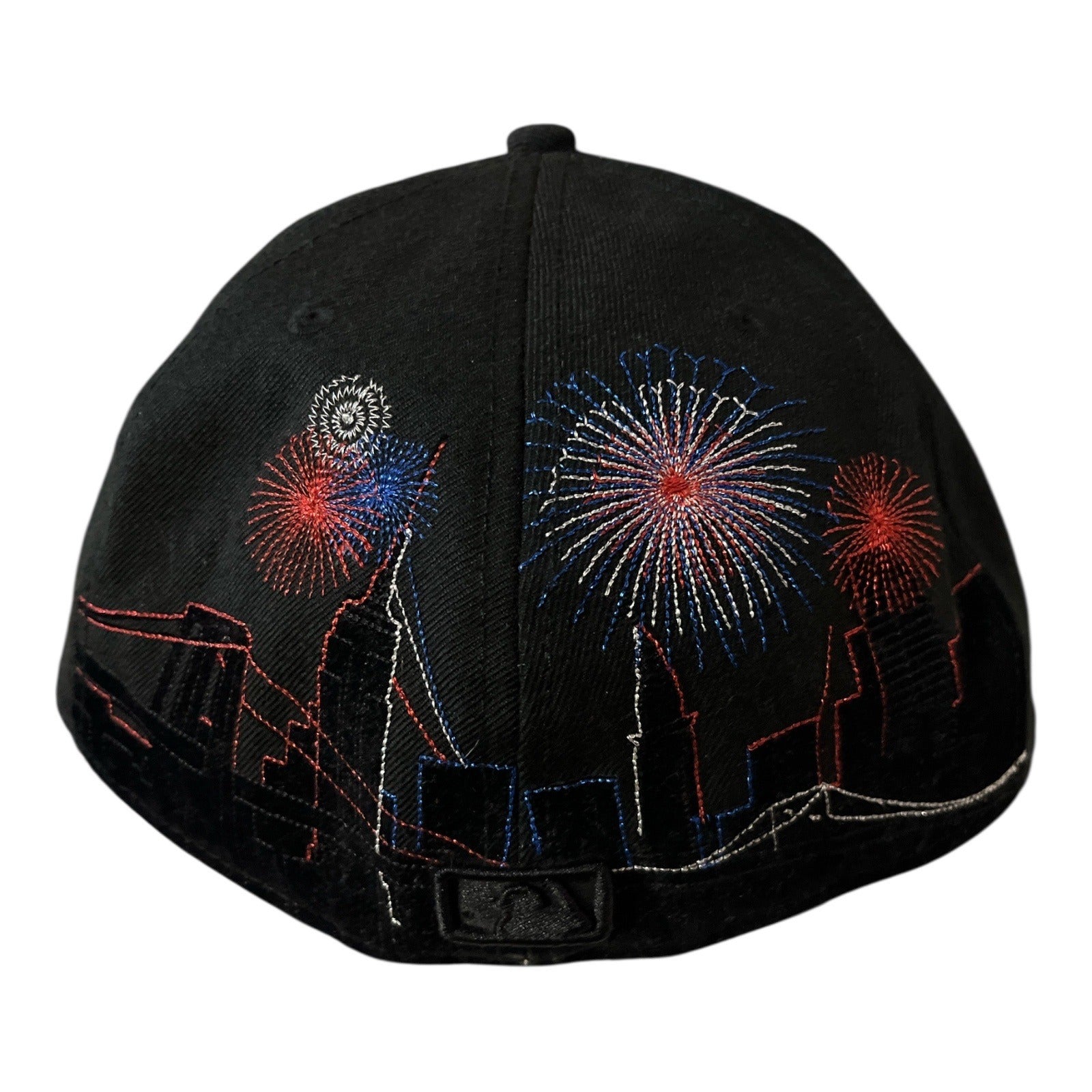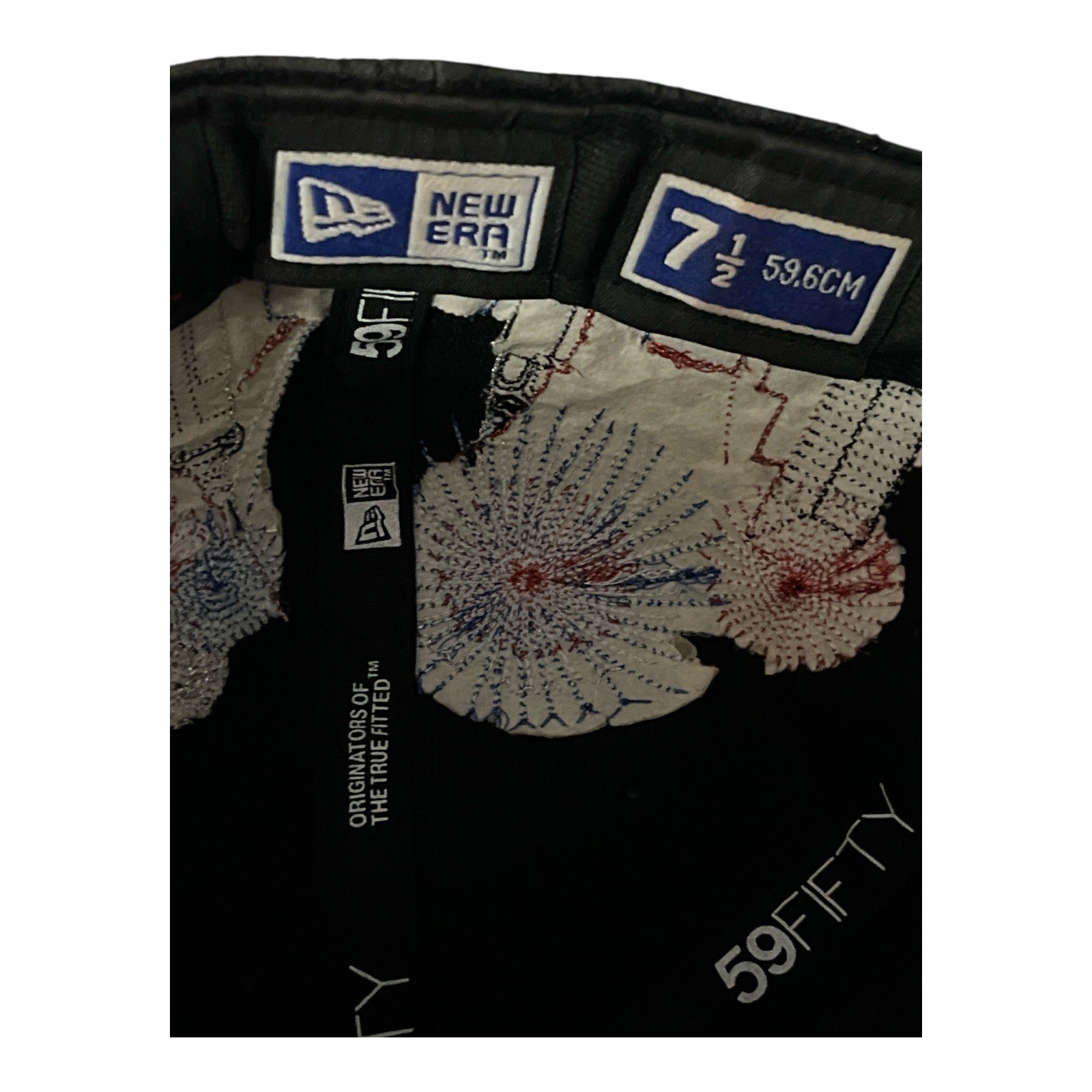 New Era 59FIFTY fitted Yankees hat featuring an embroidered New York City skyline with red, white, and blue fireworks. Classic raised NY logo on the front and MLB batterman on the back. Rare and dynamic wraparound design. Size 7 1/2 (59.6 cm).