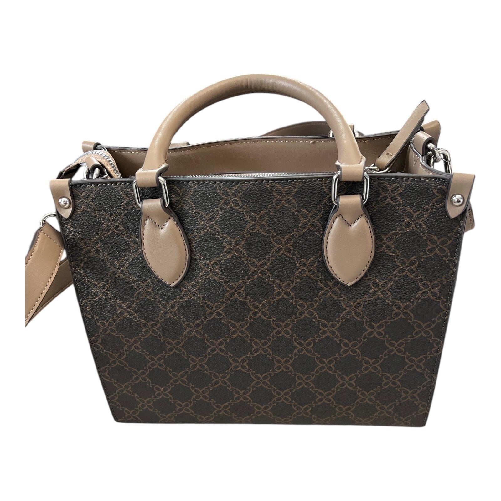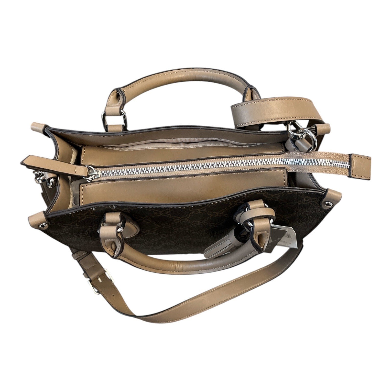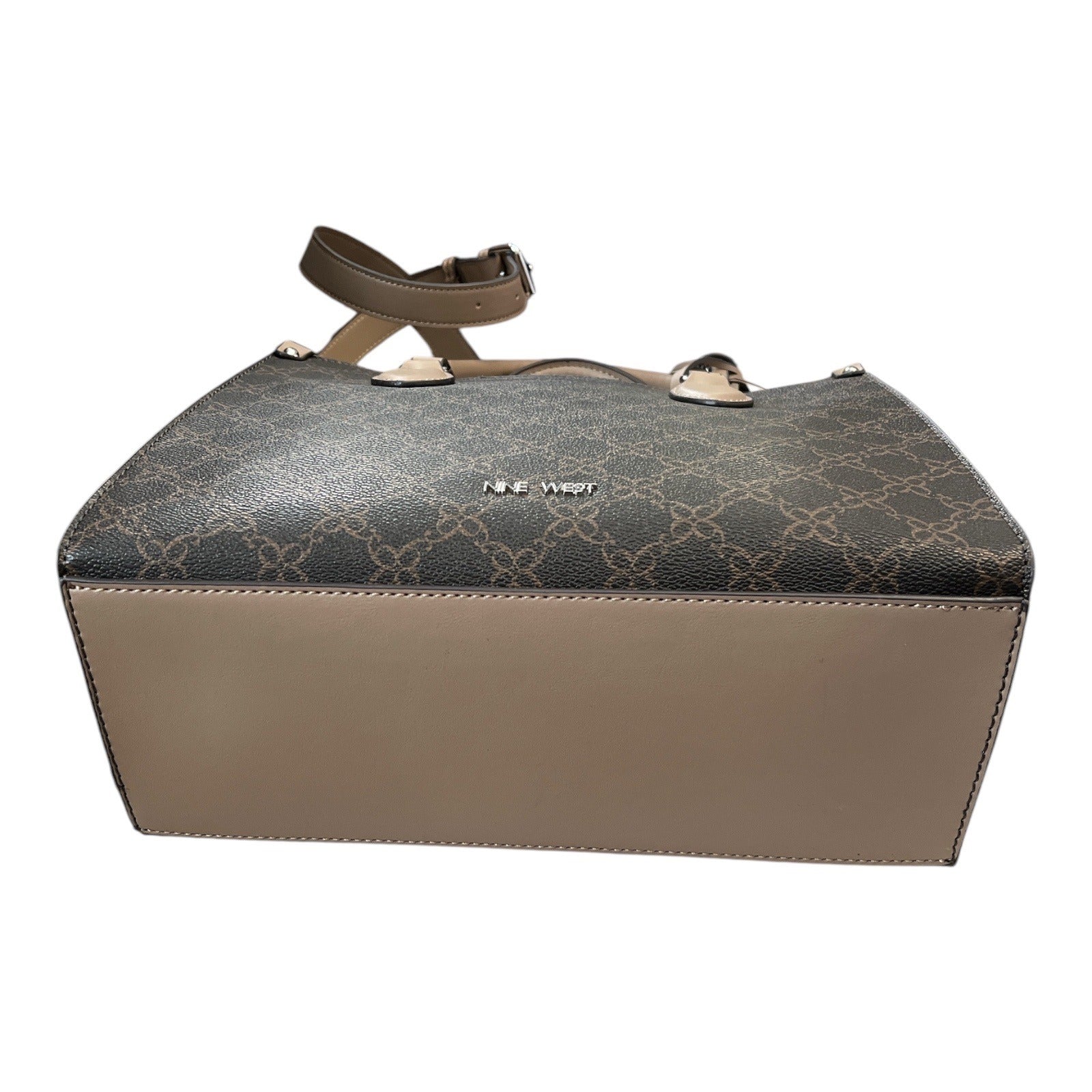 Nine West structured satchel handbag featuring a brown monogram exterior with taupe faux leather trim. This bag has a polished, modern look with clean lines, silver-tone hardware, and a removable crossbody strap for versatile wear. Purchased new last year and never used, still with original Nine West tags attached. A practical everyday bag with a classic designer style.