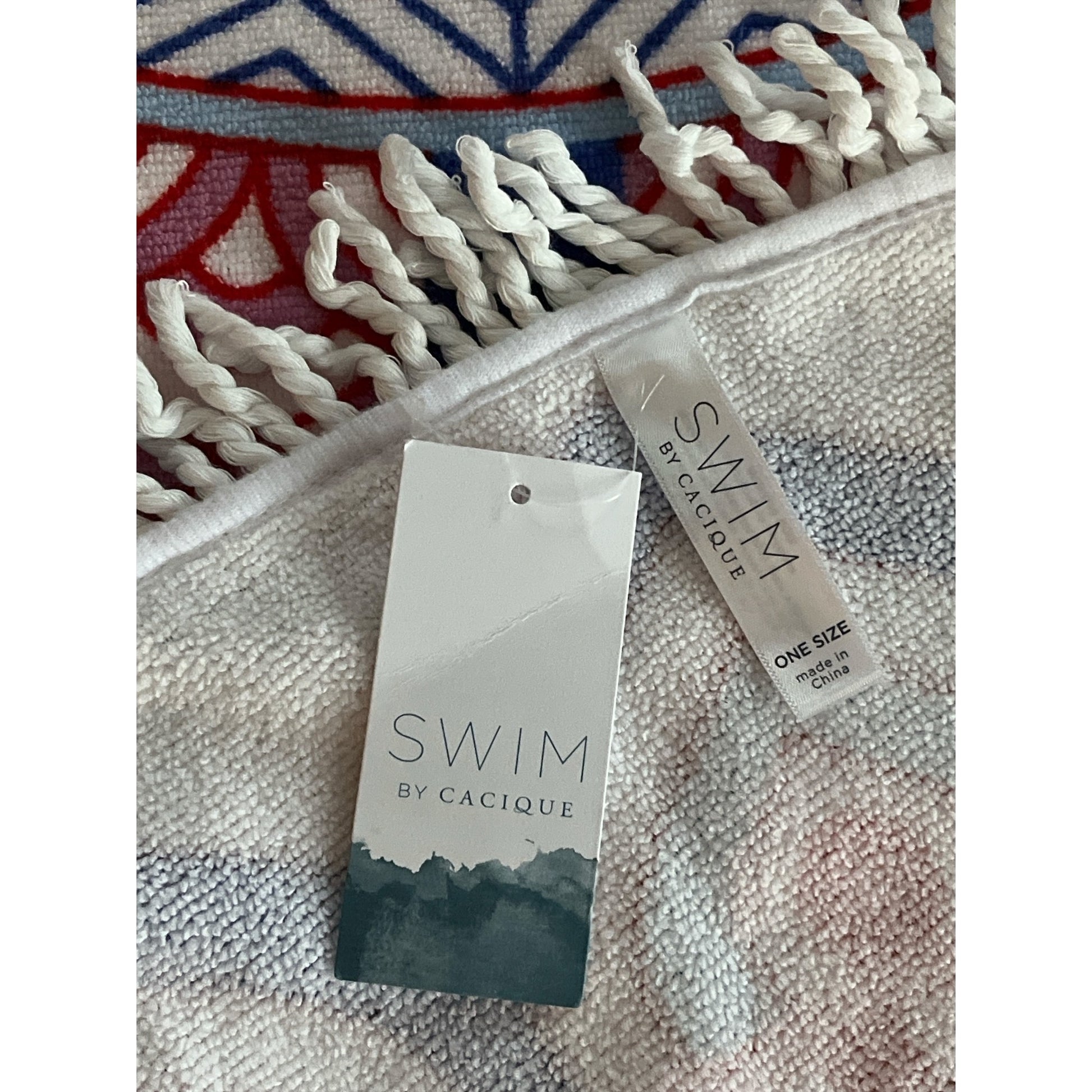 This new with tags Swim by Cacique round beach towel by Lane Bryant features a bold mandala pattern in red, white, and blue with soft fringe trim. Perfect for the beach, poolside lounging, picnics, or as a boho-inspired throw. Its oversized 61" round shape offers extra coverage and comfort. The cotton blend terry backing adds absorbency and a soft feel.