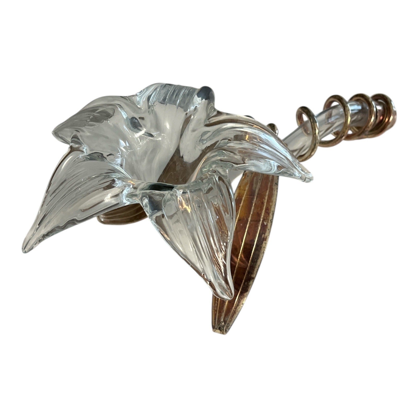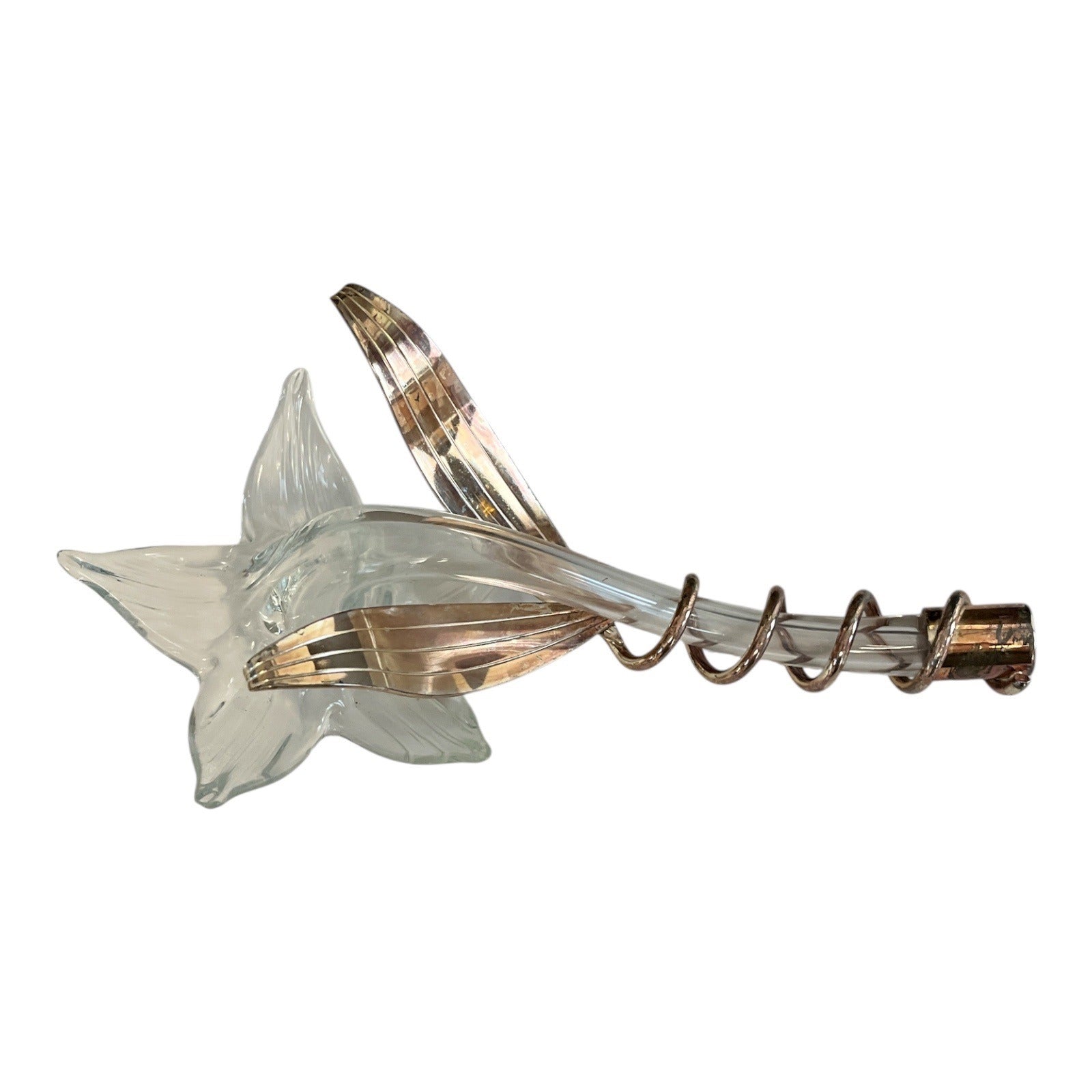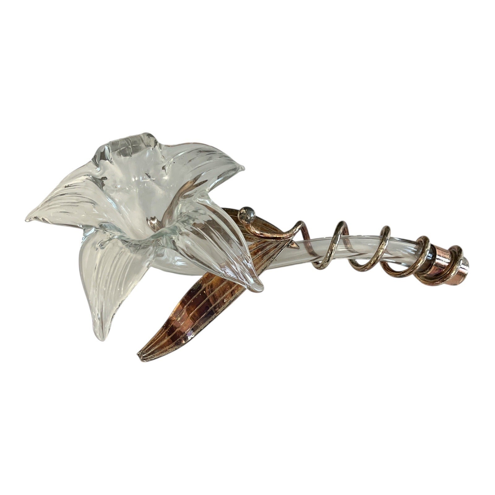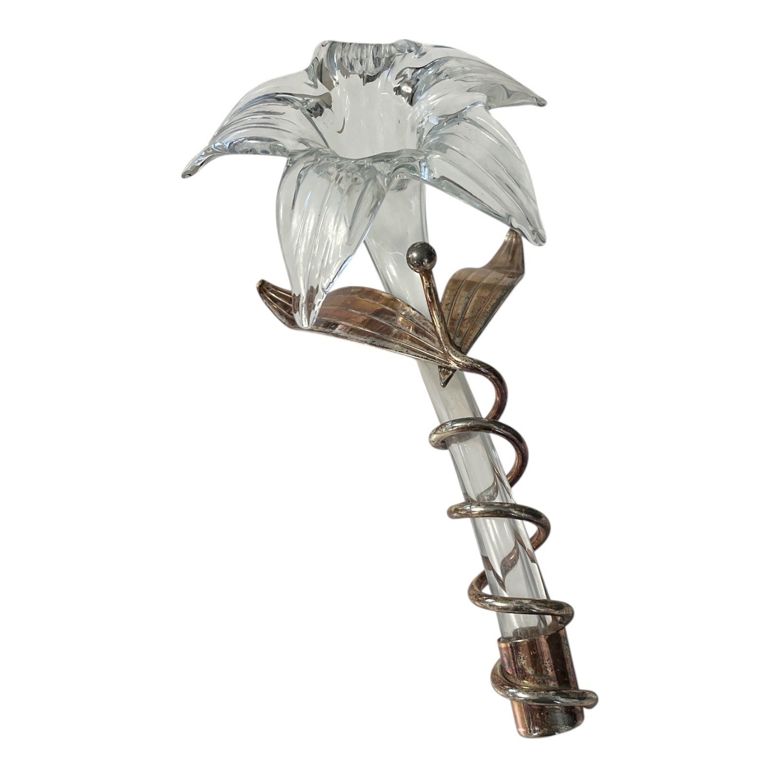 This elegant vintage bud vase features a hand-blown clear glass lily blossom gracefully paired with a silver-plated metal stem and leaf accents. Often called the “Amaryllis” or reclining floral vase, it reflects Oneida’s artistry in combining glass and metal during the late 20th century.