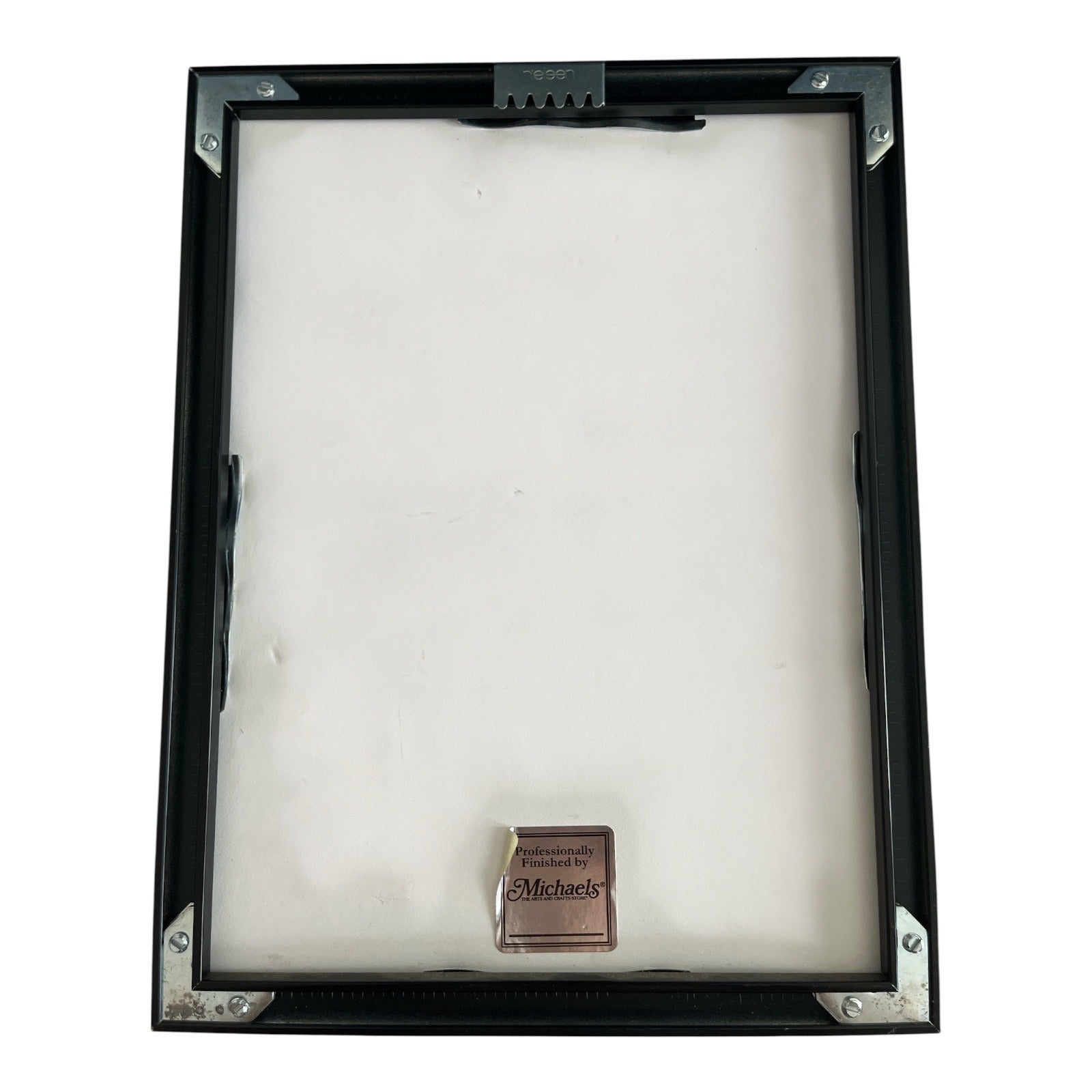 * Framing: black frame under glass; paper backing shows “Professionally Finished by Michaels”*sticker