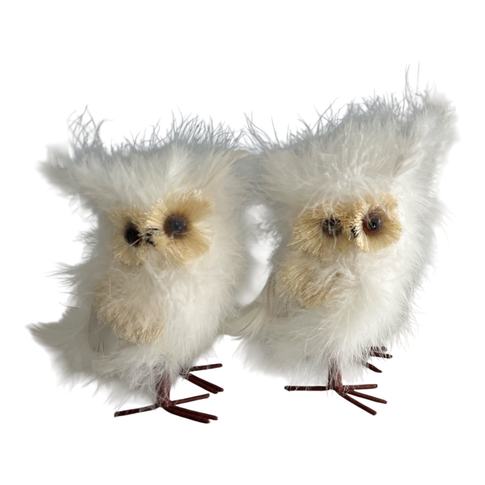 Set of two vintage feathered owl figurines with fluffy white plumage and brush detail around the eyes. Each owl has plastic eyes and wire-wrapped feet, making them easy to stand or perch as decorations. Perfect for rustic woodland décor, Christmas displays, or collectors of vintage animal figurines.