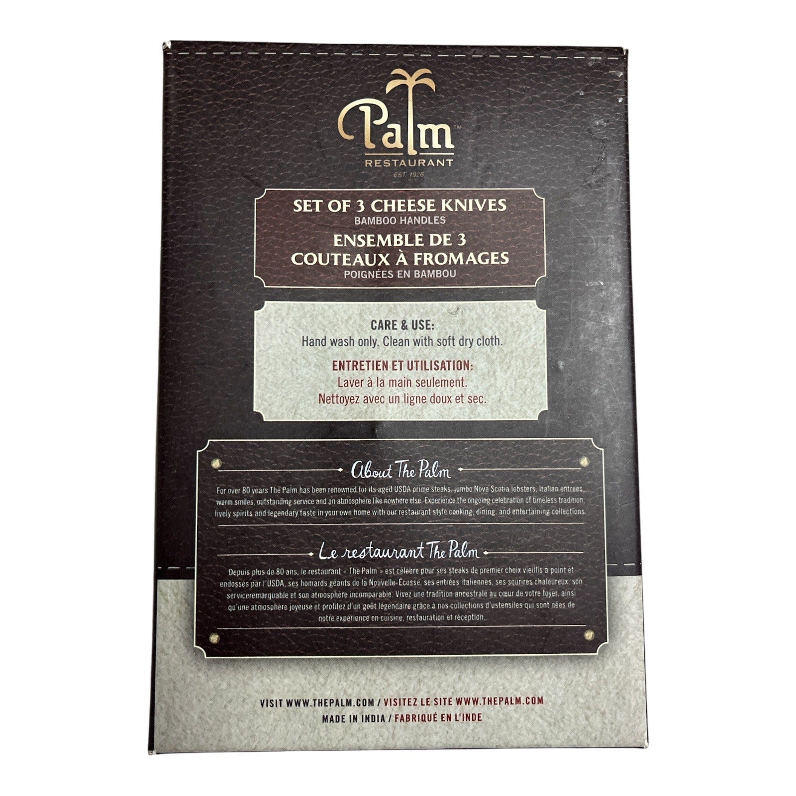 Elegant Palm Restaurant set of 3 cheese knives with polished bamboo handles and quality stainless steel blades. Perfect for soft and hard cheeses, this boxed set makes a great gift for entertaining or for a cheese lover’s kitchen.