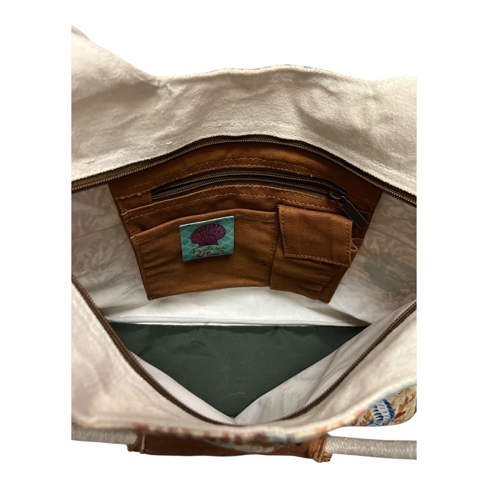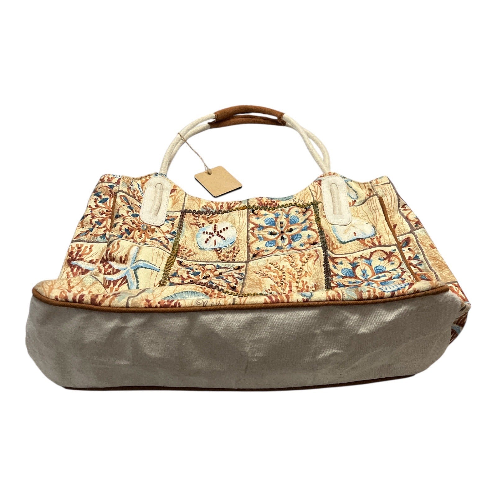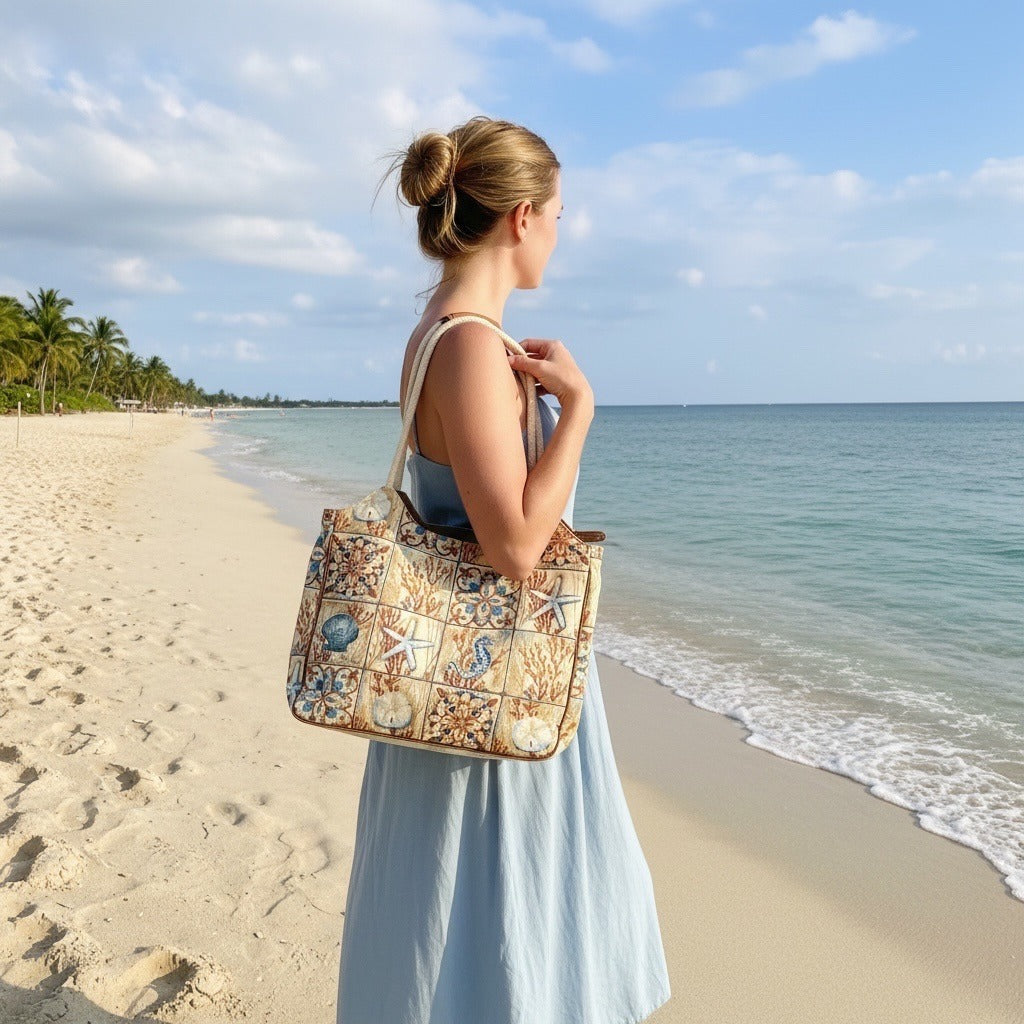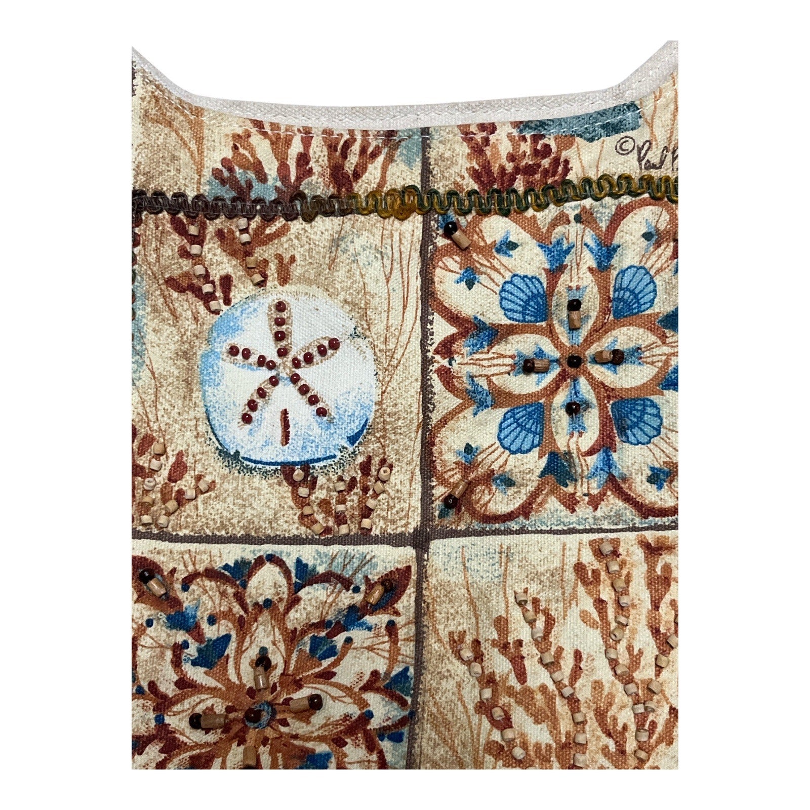 Early 2000s vintage Paul Brent tote bag featuring a detailed coastal patchwork design inspired by seaside and nautical motifs. The exterior showcases seahorses, starfish, shells, coral, and decorative tile-style panels in soft sand, blue, and warm rust tones. Subtle bead embellishments add texture and visual interest throughout. Designed with sturdy double shoulder straps with a padded grip and a full zip-top closure. The lined interior includes a zip pocket and slip pockets, making it practical for everyday use, travel, or beach outings.