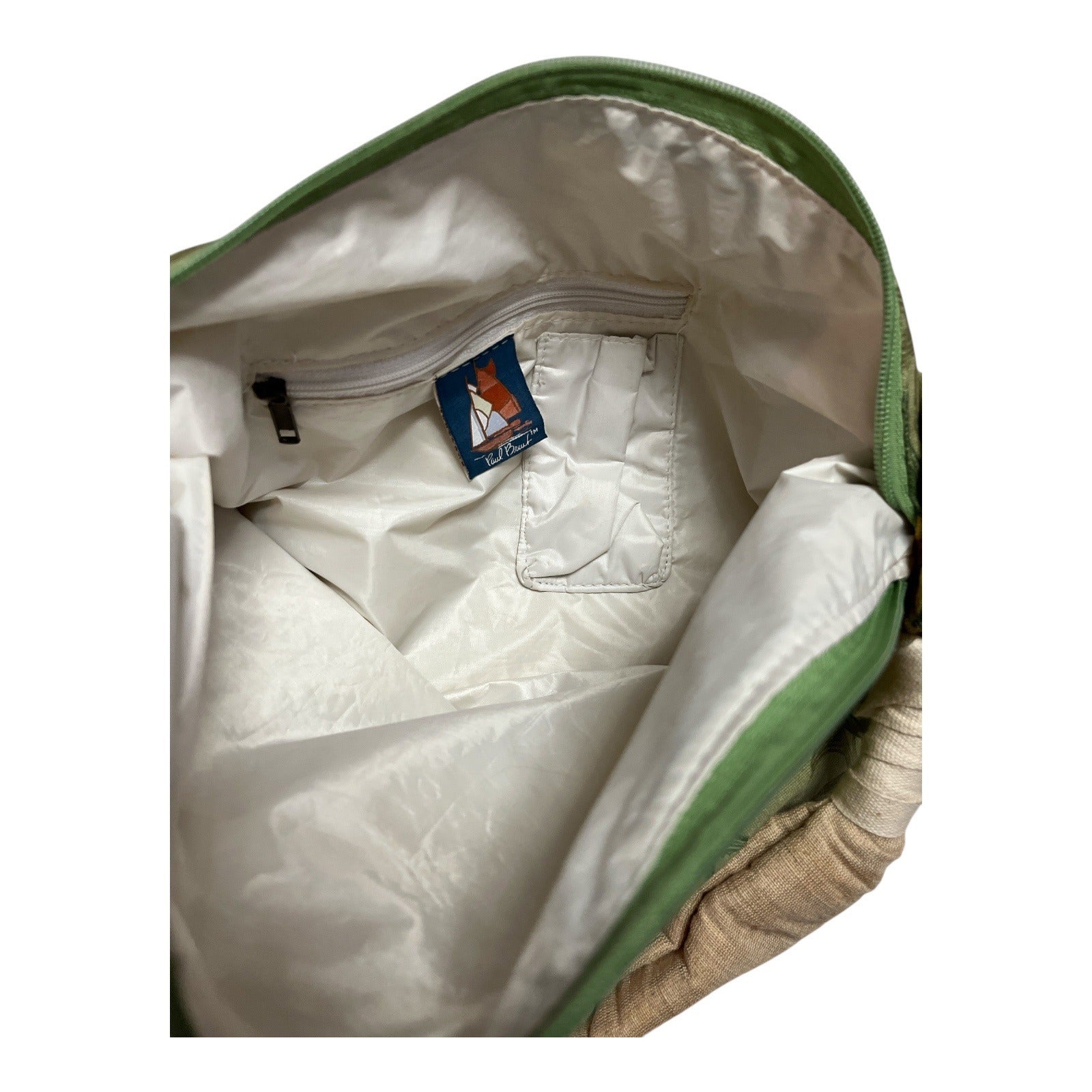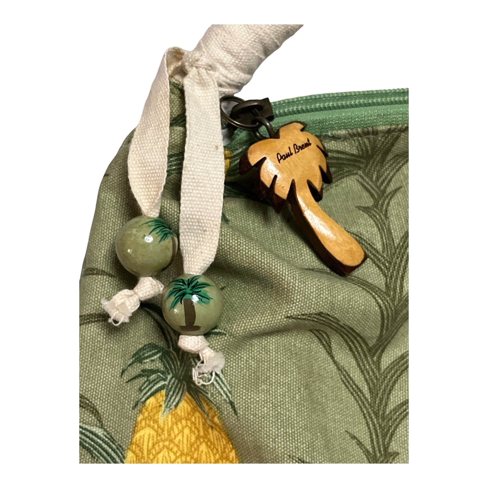 Fun and functional Paul Brent shoulder bag featuring a tropical pineapple and palm tree print. This roomy tote has a soft canvas body with a subtle sheen, a padded fabric handle, and charming wooden and bead accents. A classic early-2000s tropical design that works well for everyday use, beach days, or casual outings.