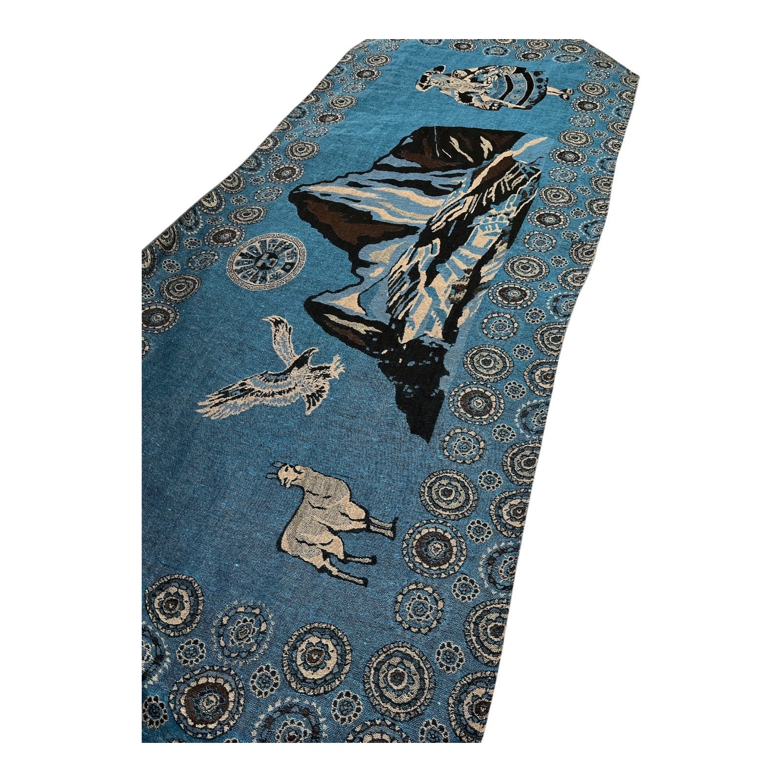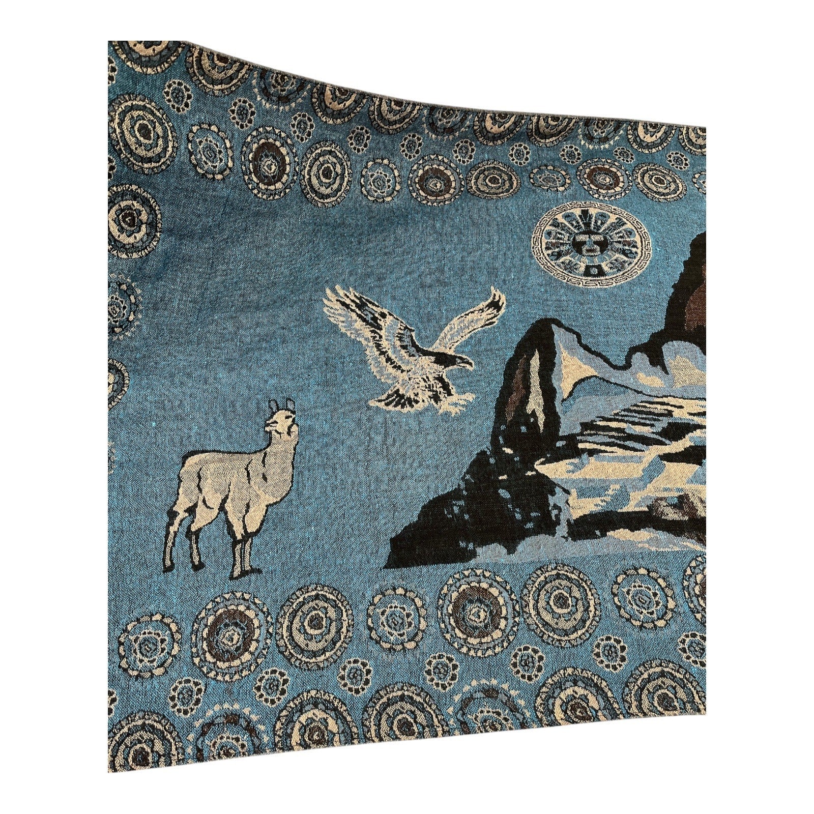 Striking woven shawl featuring a detailed Andean mountain scene with a condor, llama, and traditionally dressed figure. Crafted in rich shades of blue, beige, and brown, this soft textile showcases intricate circular border motifs and delicate fringe at the ends. Perfect as a wrap, shoulder shawl, or as a unique decorative wall or furniture accent.