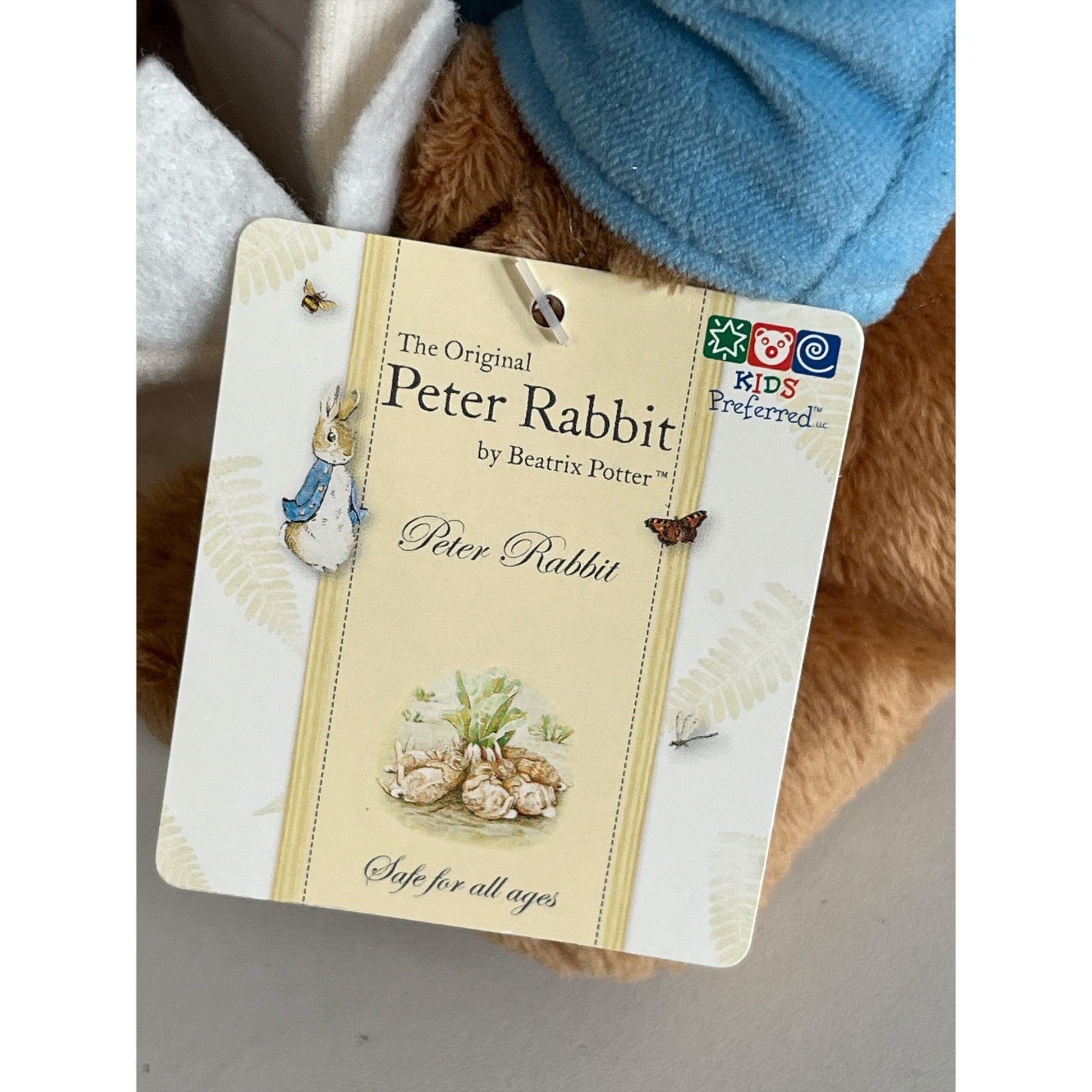 Adorable Peter Rabbit plush by Kids Preferred featuring the classic Beatrix Potter character in his signature blue jacket. He is holding a soft white felt-style basket embroidered with “Peter Rabbit” and spring details including a bee and greenery. Licensed 2008 edition with original tags attached. A sweet collectible or nursery gift for fans of The World of Beatrix Potter.