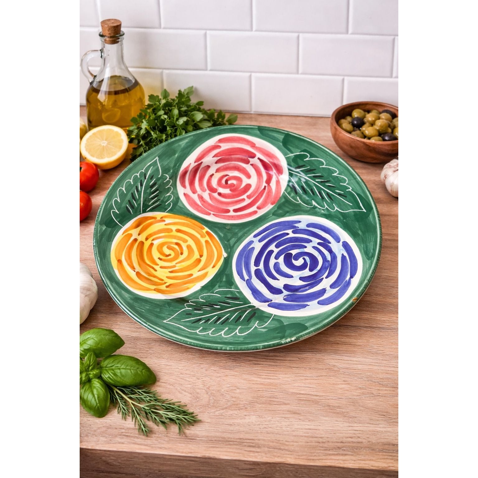 Large 13 inch hand painted ceramic platter made in Italy exclusively for Pier 1 Imports. Features three bold spiral florals in red, yellow, and blue against a rich green background with stylized leaves. A vibrant Mediterranean-inspired serving piece perfect for entertaining, display, or wall decor. Back stamp reads: Handpainted Exclusively for Pier 1 Imports, Italy. Handwashing recommended.