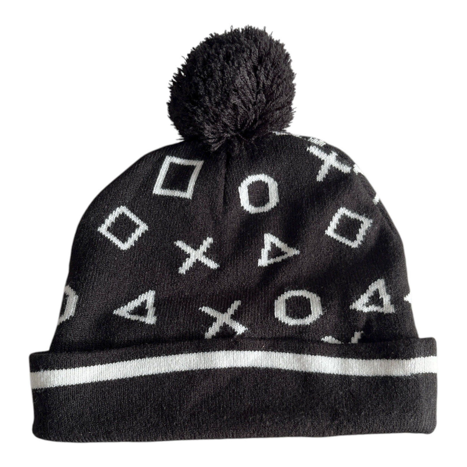 Official PlayStation knit beanie featuring the iconic controller symbols — circle, cross, square, and triangle — in white against a black background. Designed with a playful pom top and white stripe trim. Soft acrylic knit makes it warm, lightweight, and perfect for any gamer during cold-weather months.