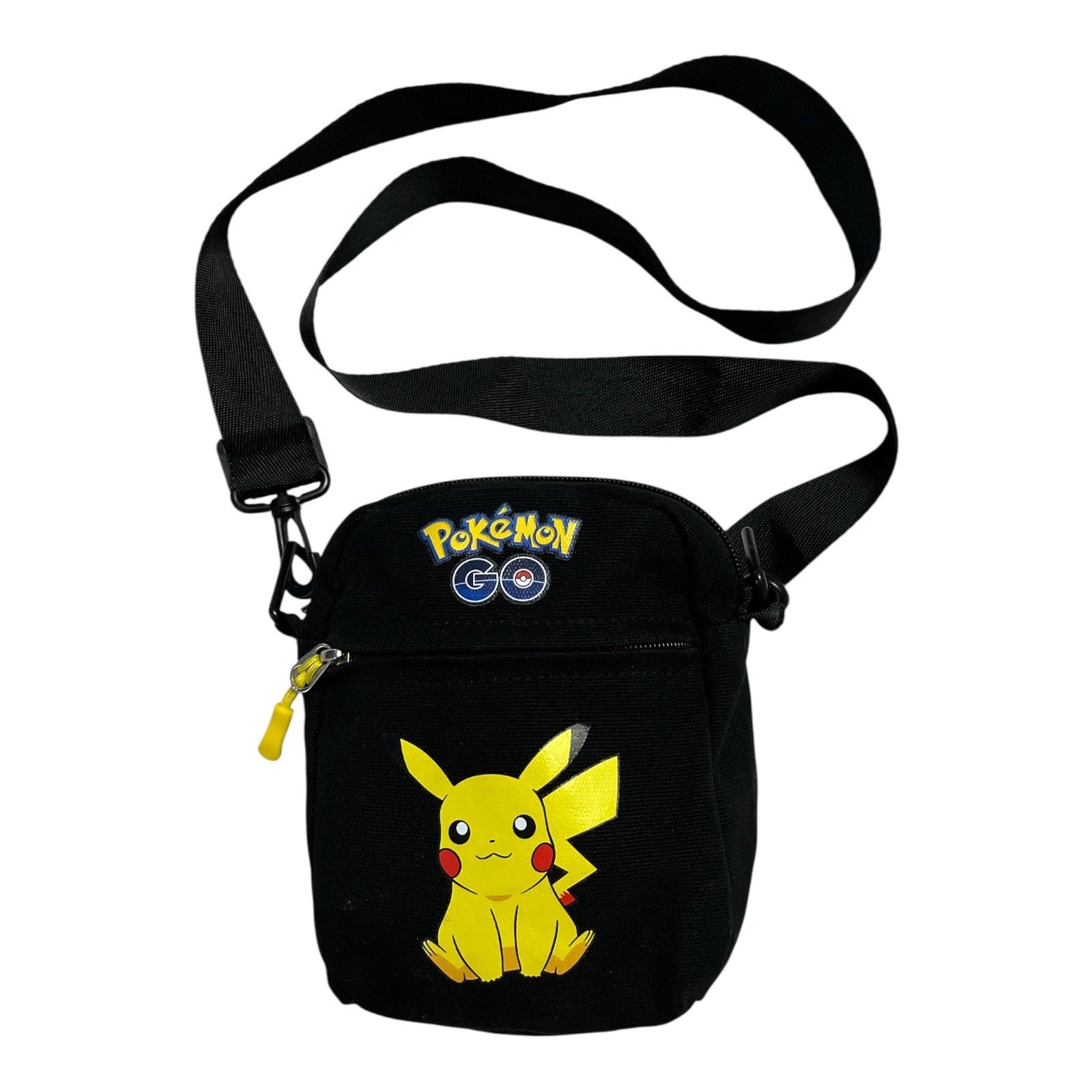 Carry your essentials with Pikachu by your side! This compact Pokémon GO crossbody bag is made of durable black canvas and features a bright Pikachu graphic on the front, along with an embroidered Pokémon GO logo above the zippered front pocket.