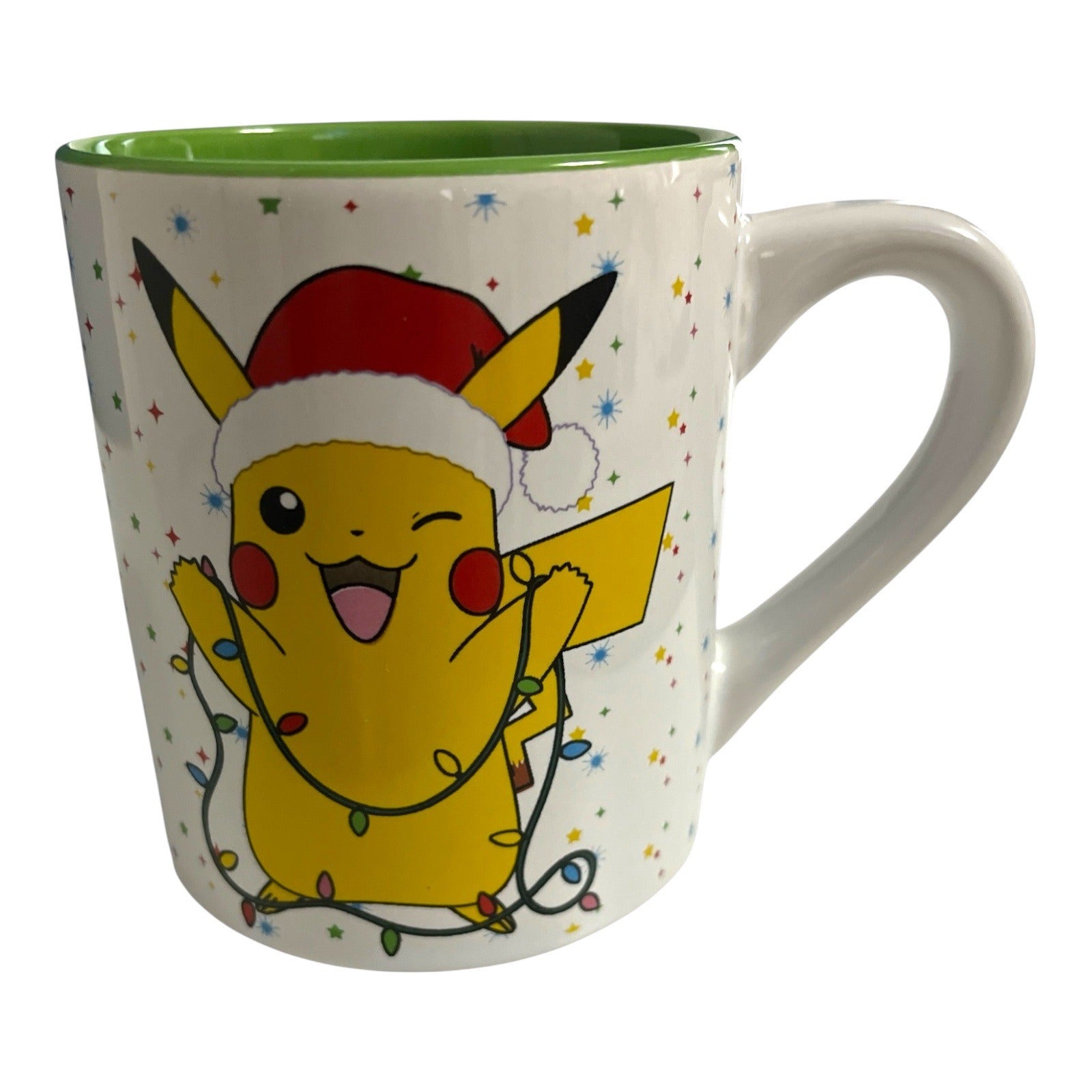 Celebrate the holidays Pokémon-style with this festive Pikachu ceramic mug! Produced by Silver Buffalo in 2021 under official license, it features Pikachu wearing a Santa hat, wrapped in colorful Christmas lights, and winking cheerfully against a backdrop of stars. The inside is a bright green for a fun pop of color. A perfect gift for any Pokémon fan or collector.