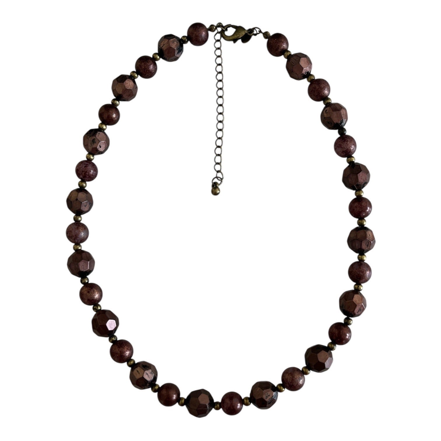 Premier Designs necklace featuring alternating faceted and smooth round beads in rich brown tones. The faceted beads have a subtle metallic sheen and are accented with small gold tone spacer beads for contrast. Finished with an adjustable extender chain and lobster clasp closure.