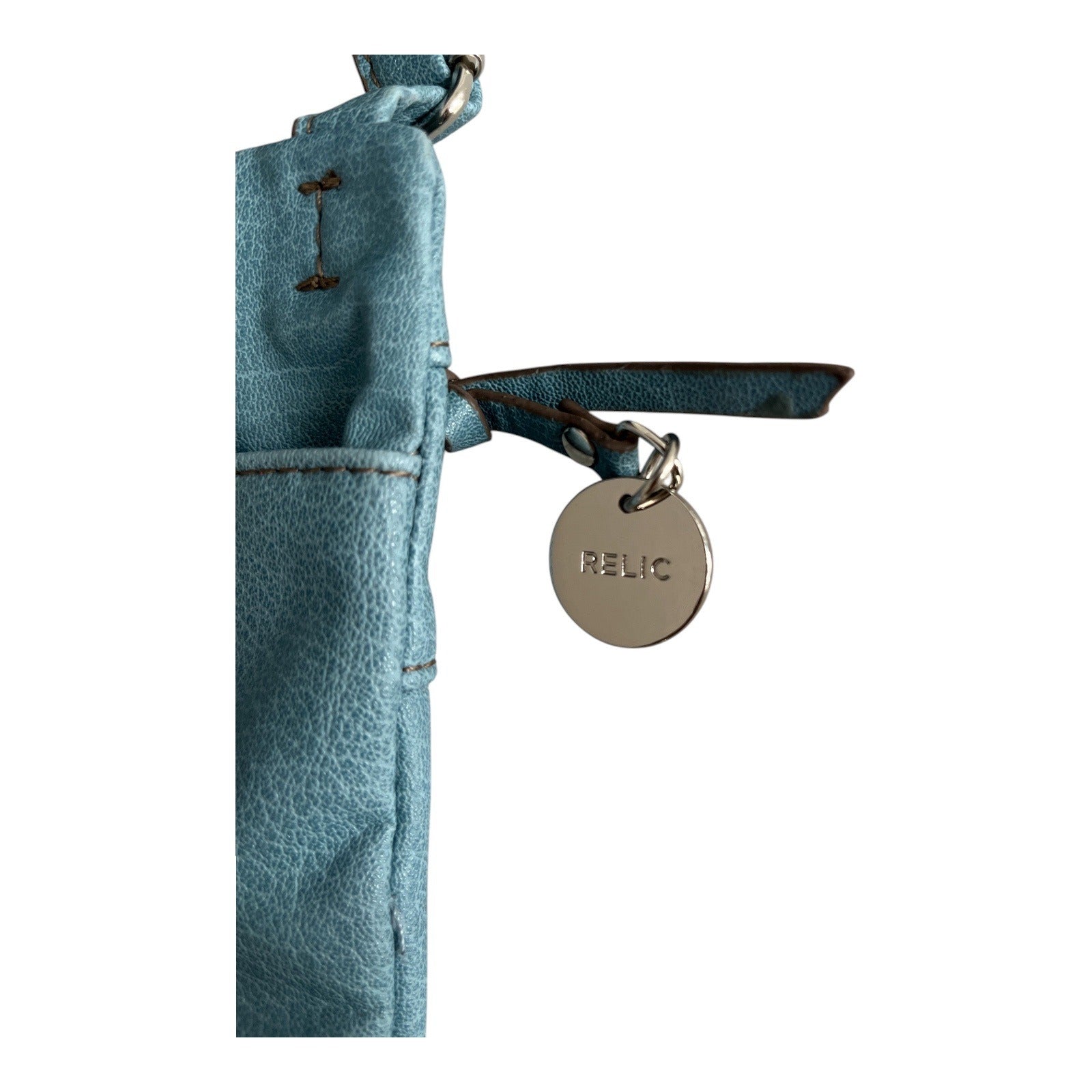 Stylish **Relic by Fossil crossbody bag** in a beautiful teal blue color. Made from soft faux leather with a modern slim profile and two front zippered pockets for easy organization. The bag features silver-tone hardware, a signature Relic logo charm, and a fully lined interior with slip pockets. Perfect for everyday wear or travel when you want to keep essentials close at hand.