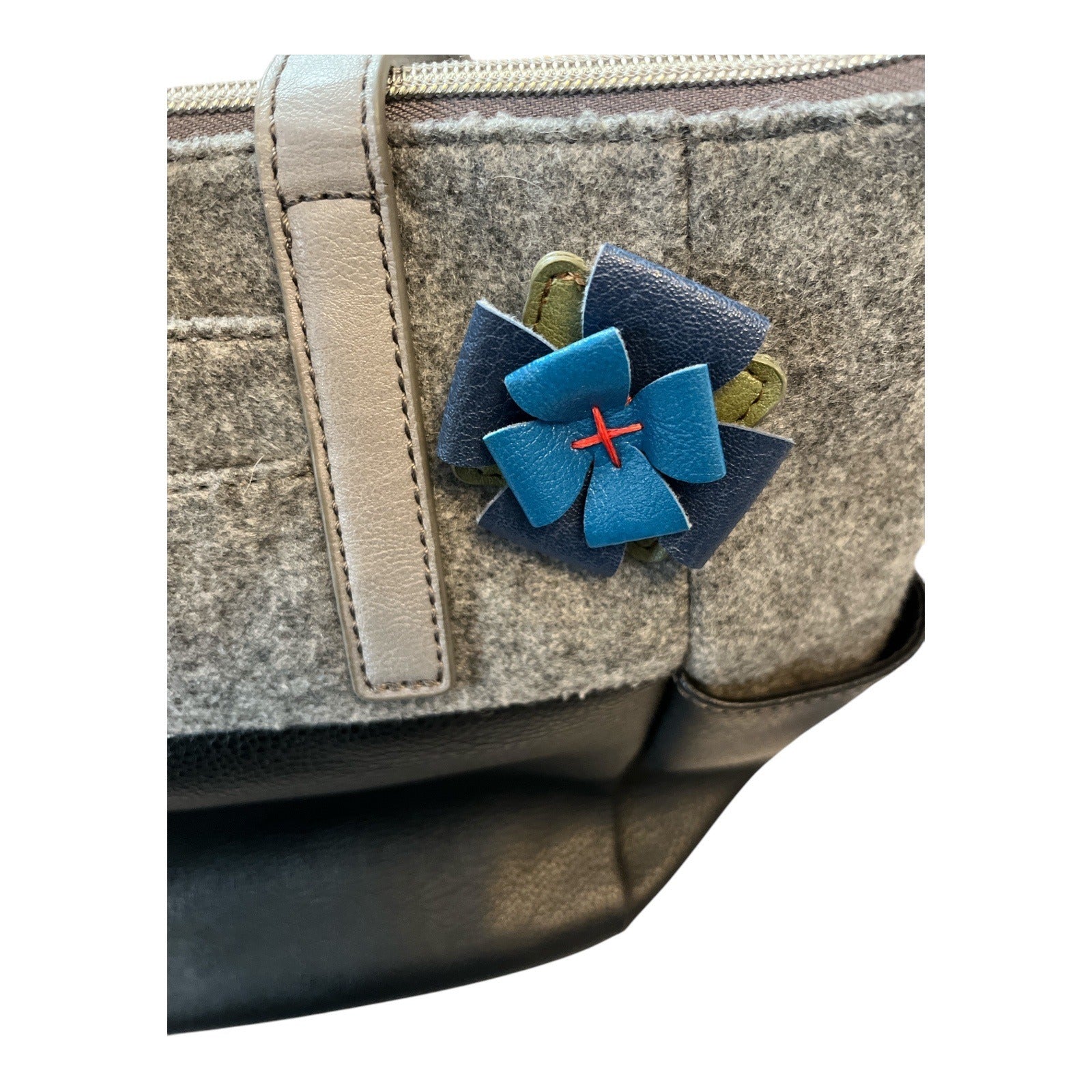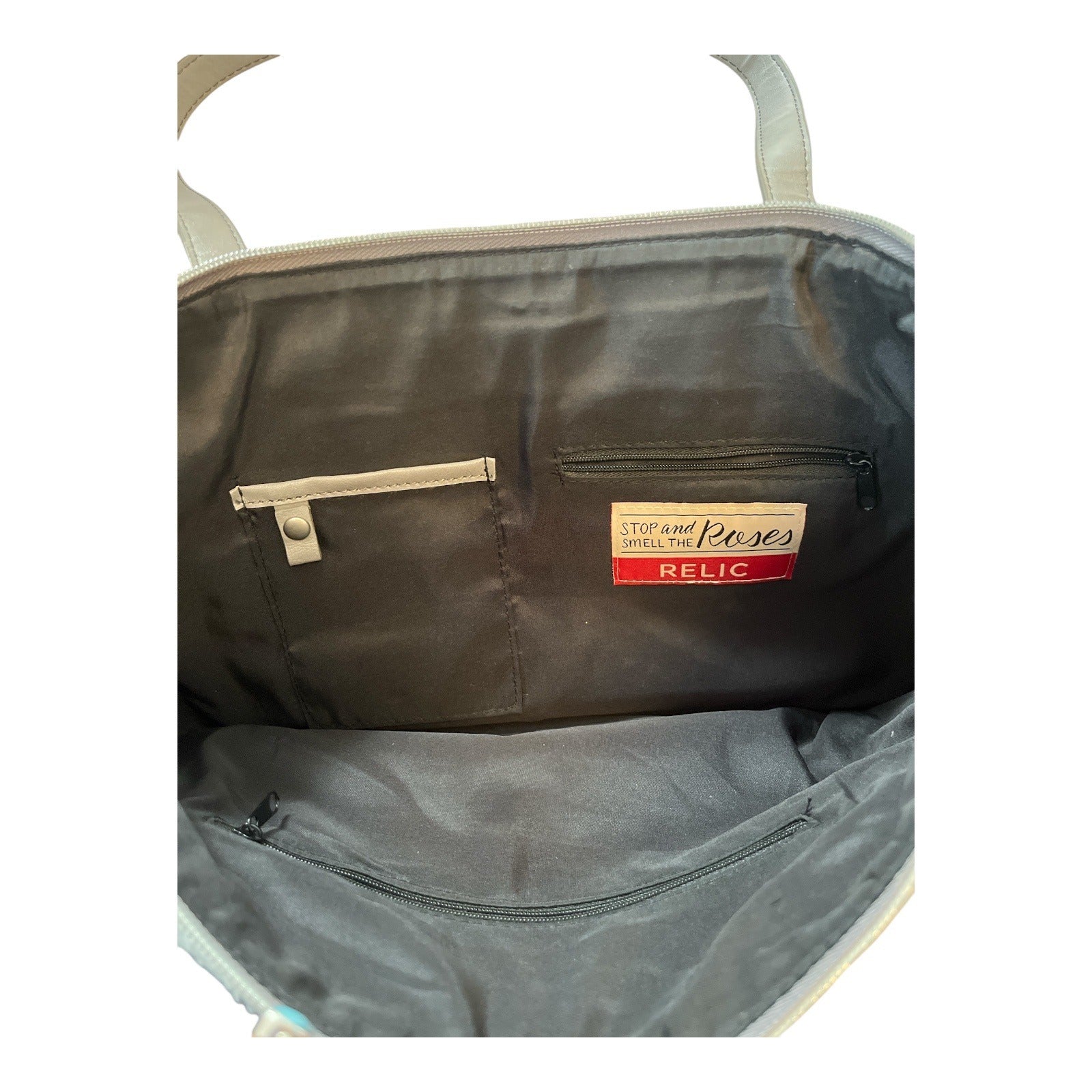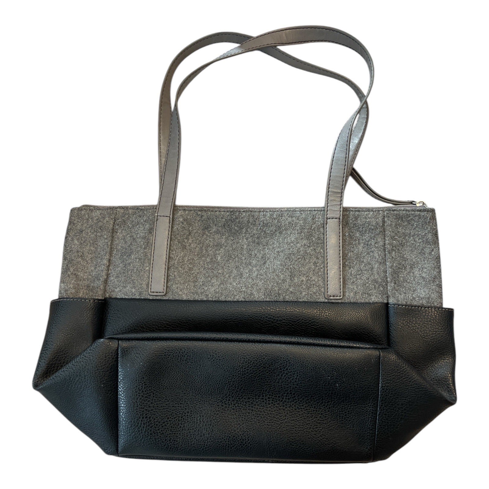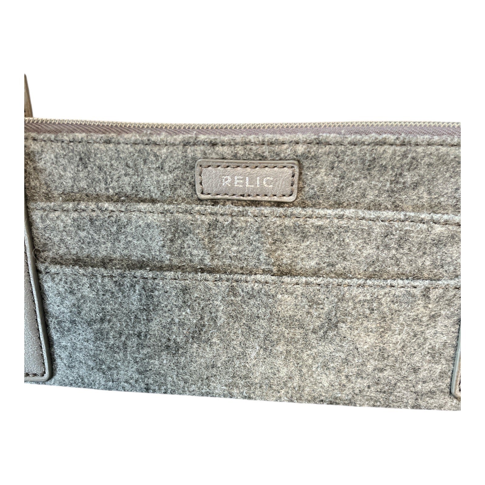 Vintage Relic tote from the early to mid 2000s featuring a structured felt body with faux leather base and trim. Clean, minimalist design with long shoulder straps and a roomy interior. Neutral gray and black colorway with a small floral accent detail on the exterior. Fully lined interior with zip and slip pockets. A practical everyday bag with subtle vintage character.