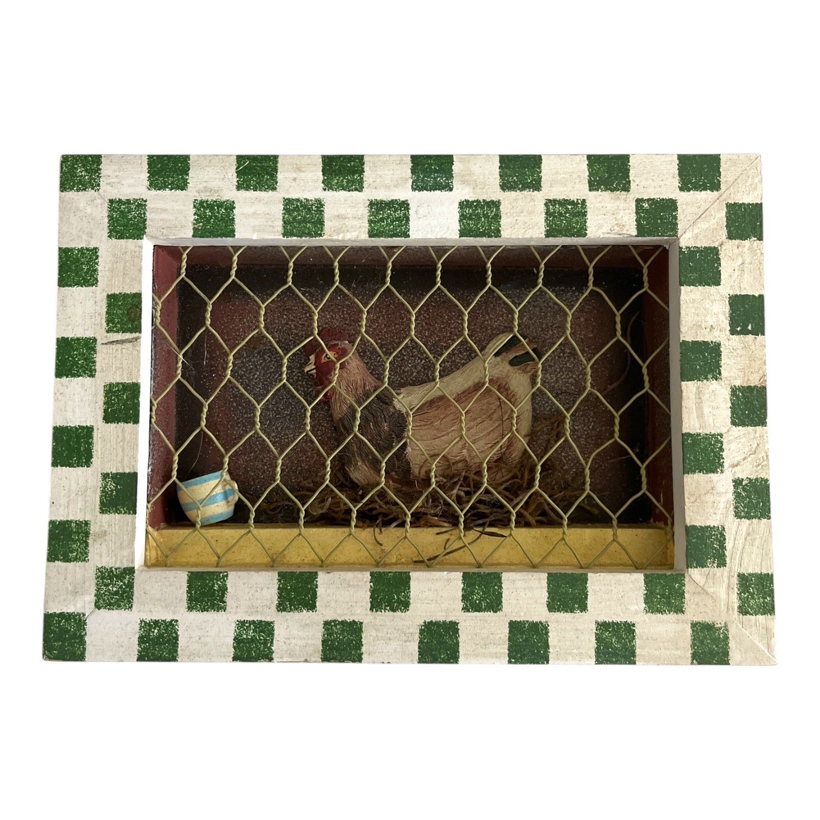Bring a touch of country charm into your home with this **rustic farmhouse shadow box**. The piece features a three-dimensional hen in a coop, complete with nesting straw, a small feed bucket, and a protective layer of chicken wire over the front. The scene is framed with a **green-and-white checkered wooden border**, giving it a classic cottage-style look.