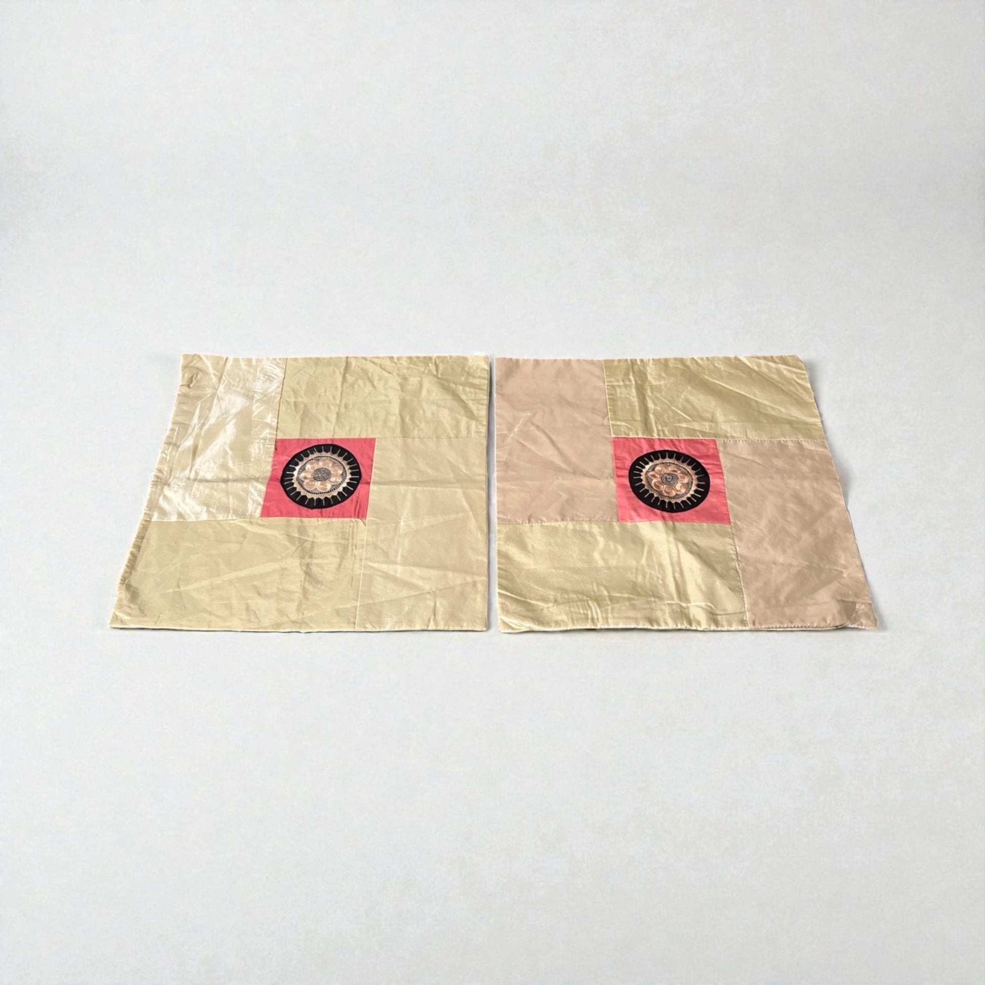 Set of two matching boho-style silk pillow covers featuring a centered embroidered mandala patchwork design in beige, pink, and black. Each cover measures approximately 16.5 inches and includes a hidden zipper closure. Stylish and lightweight — perfect for sofas, chairs, or bedroom décor.