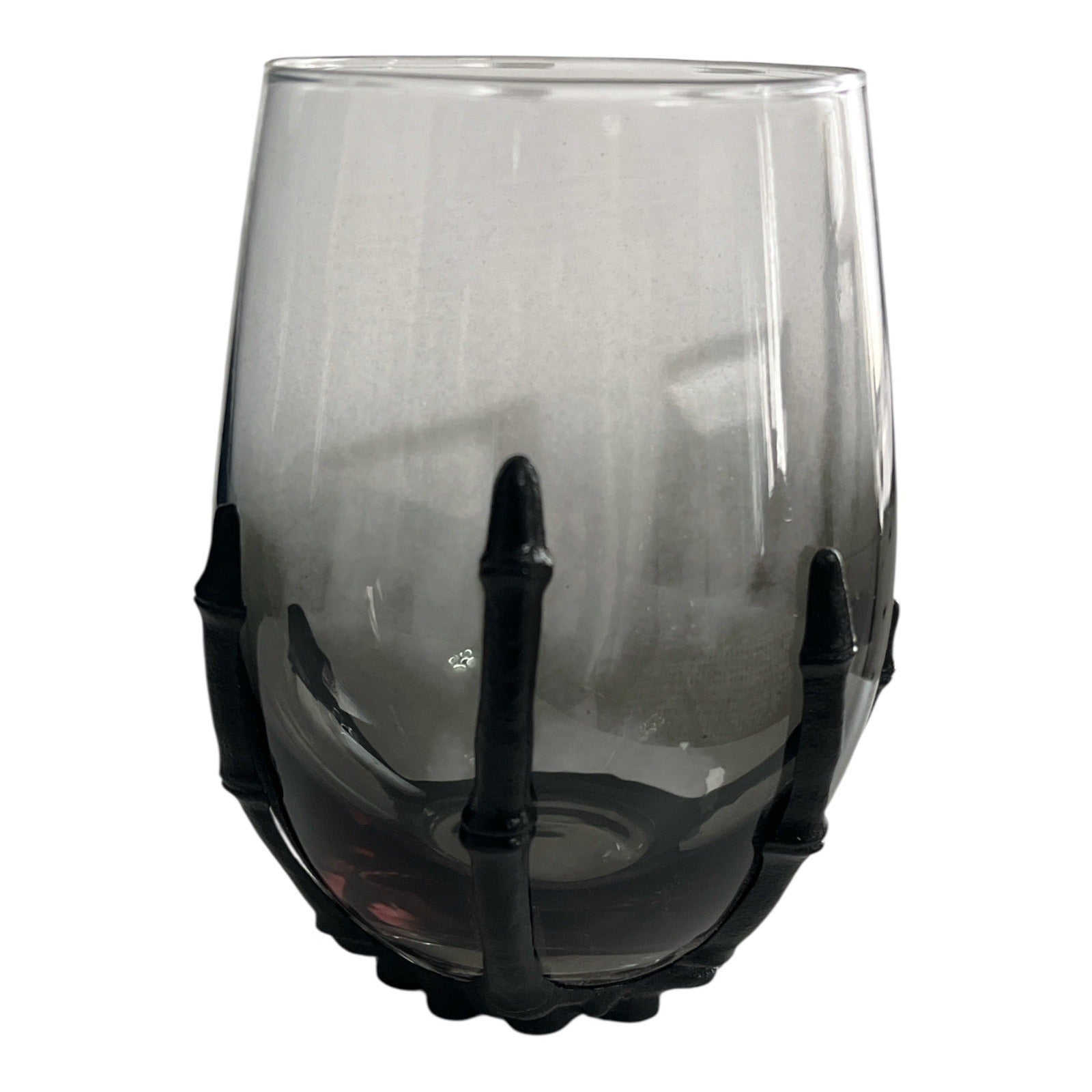 Set of 3 Smoke Gray Glasses with Black Skeleton Hand Holders Gothic Halloween Barware