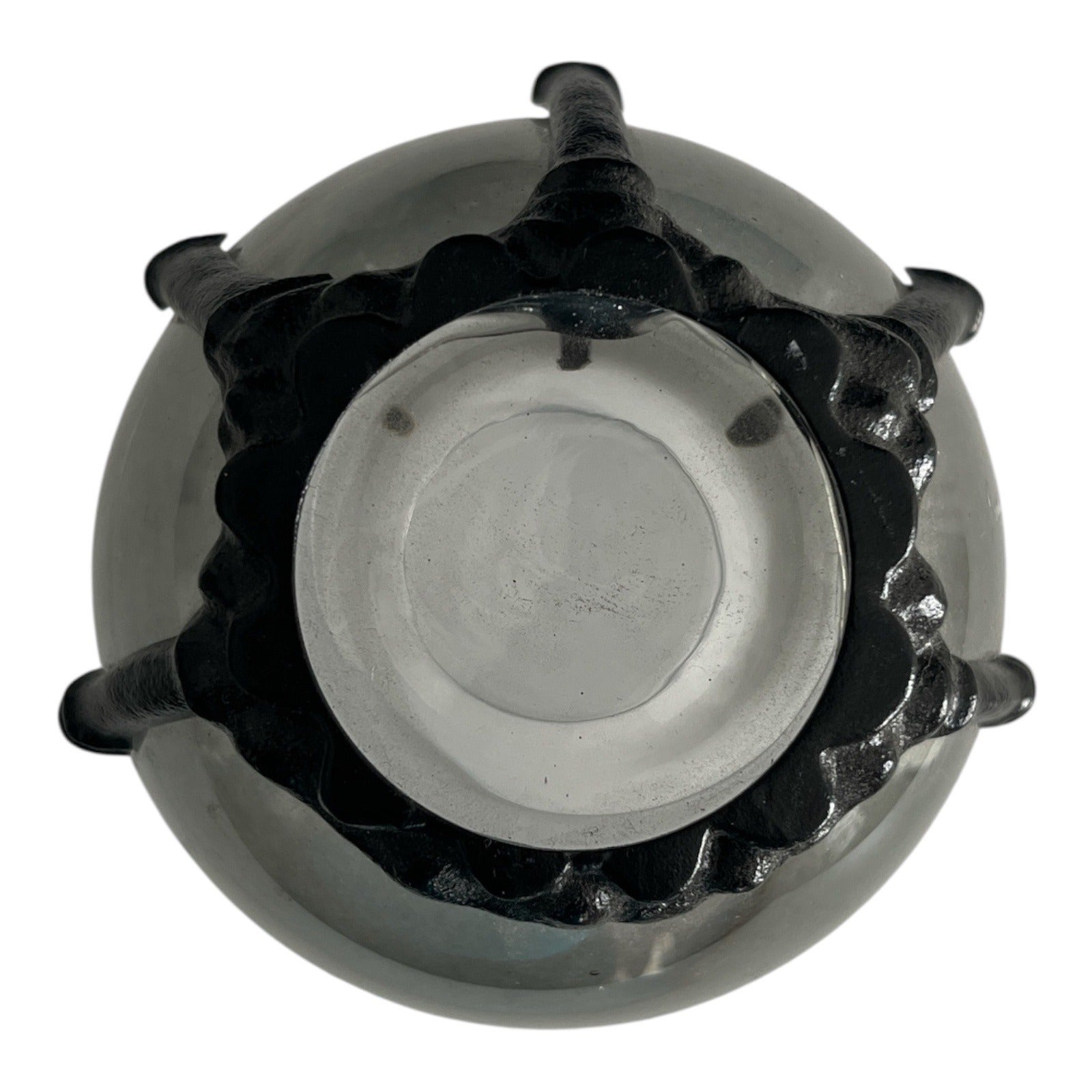Set of three smoke gray drinking glasses with black metal skeleton hand holders that look as though they’re gripping the glass. Perfect for Halloween entertaining, gothic table décor, or adding a spooky twist to your barware collection. Similar styles have been produced by modern retailers such as Pottery Barn, but these remain a timeless gothic statement piece.