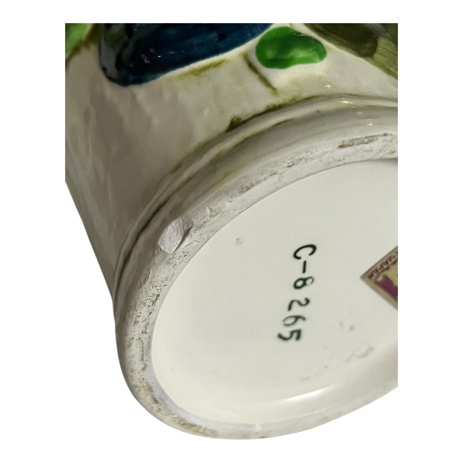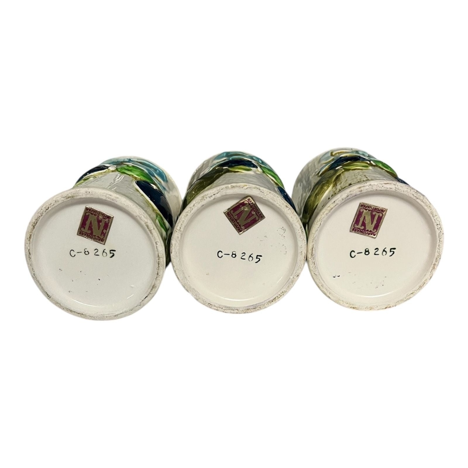 Charming set of three vintage Napco ceramic tumblers featuring raised blue bows and colorful fruit accents. Each piece has a hand-painted look with subtle glaze variation and a slightly rustic finish. The undersides are marked “C-8265” with original Napco Japan foil labels.