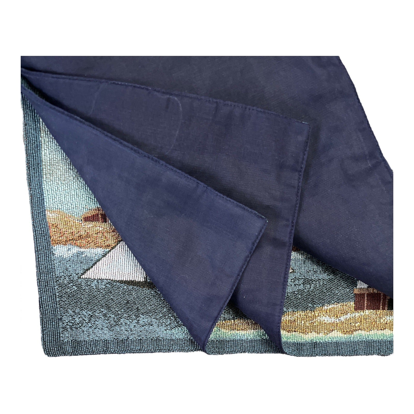 Add a touch of coastal charm to your dining décor with this set of four tapestry-style placemats from P.P. Home Collection. Each placemat features a detailed nautical design with lighthouses and sailboats in a rich, woven finish. The reverse side is solid navy, offering a clean and versatile look.