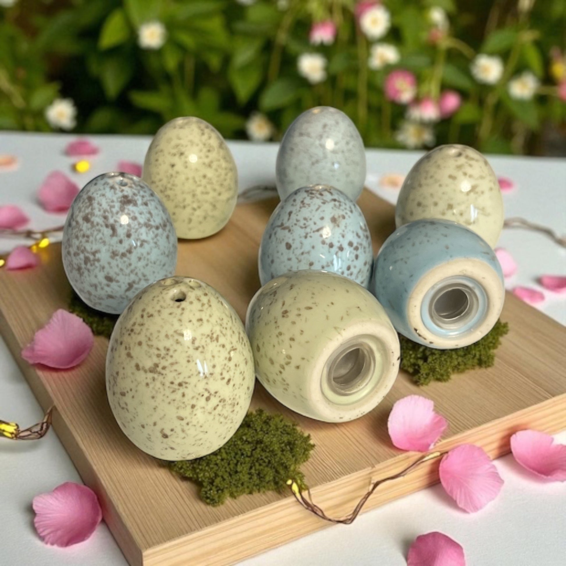 Add a charming touch to your spring table with this set of 8 ceramic speckled egg salt and pepper shakers. Designed to mimic real bird eggs, these shakers feature a glossy finish in soft pastel hues—light blue, sage green, and creamy beige. Each shaker has a hole at the top and a plastic stopper on the bottom for easy refill.