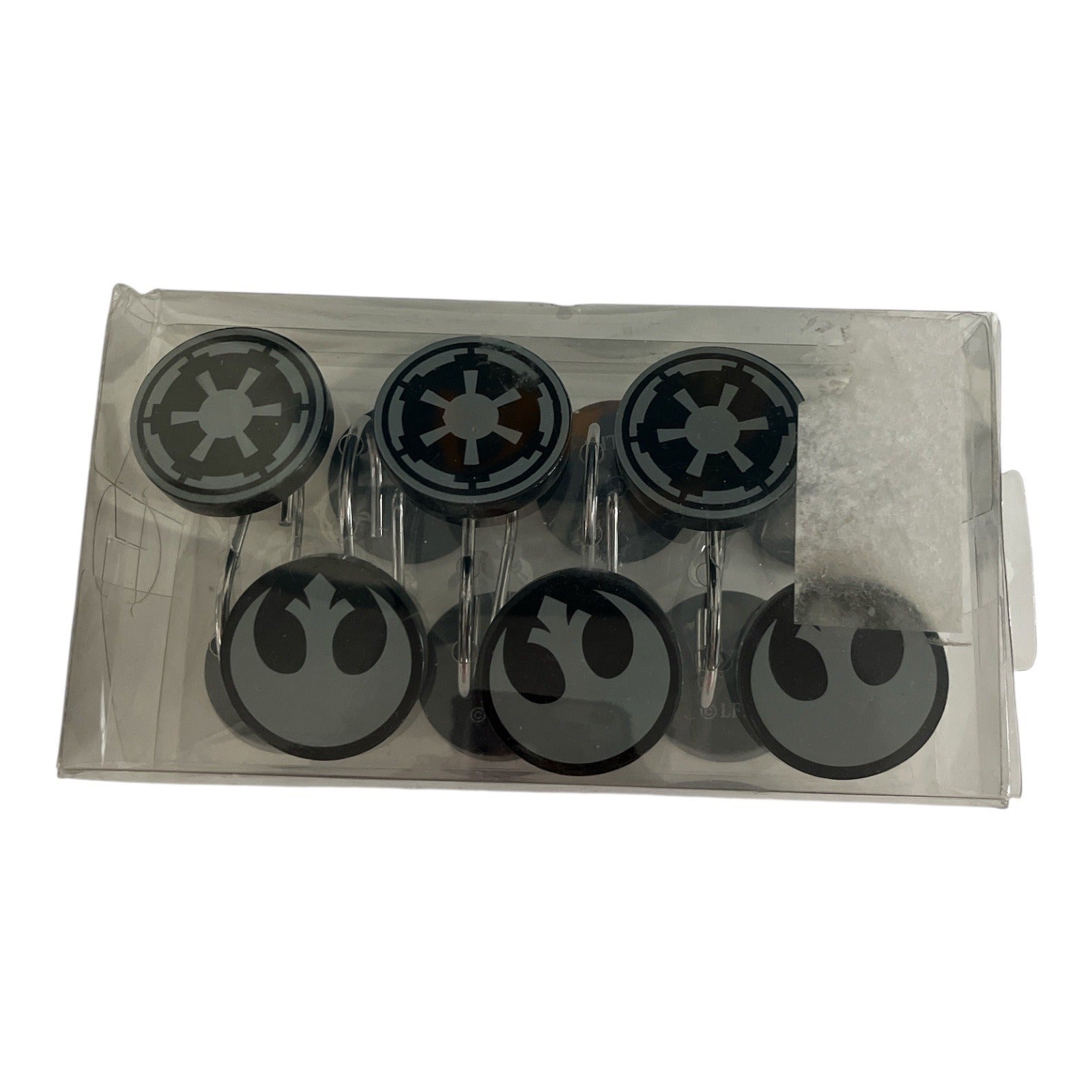 Bring balance to your bathroom décor with this officially licensed Star Wars set of shower curtain hooks. Featuring both the Galactic Empire and Rebel Alliance emblems, this set of 12 hooks lets you display your fandom in a bold, practical way. Durable and easy to install, they add the perfect finishing touch to any Star Wars-themed bathroom.