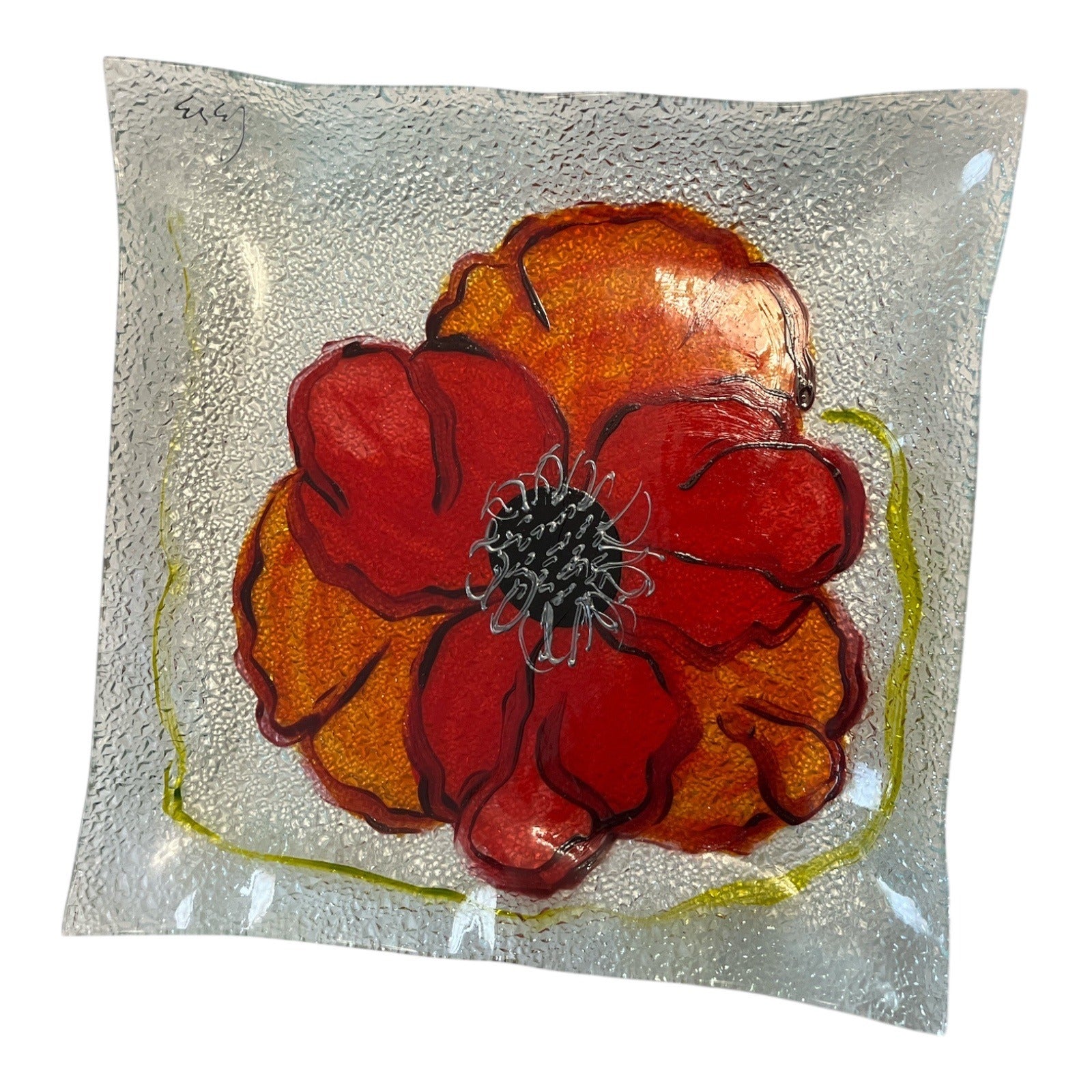 This stunning fusion glass plate features a vibrant hand-painted poppy in bold red and orange hues, accented with black and white details at its center. The textured clear glass background enhances the depth of the artwork, making this piece a striking decorative item.