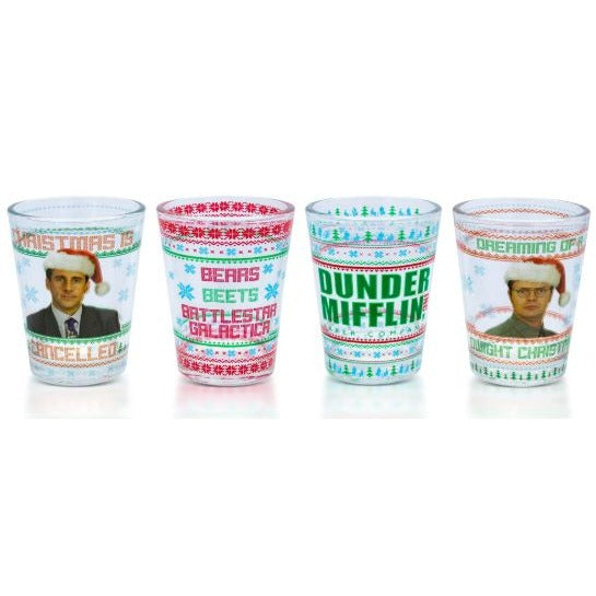 Festive glassware set featuring characters from **The Office** in holiday-themed designs. This boxed set includes four 16 oz drinking glasses with winter graphics and iconic character imagery, perfect for fans of the show. Ideal for holiday entertaining, display, or gifting to a sitcom collector.