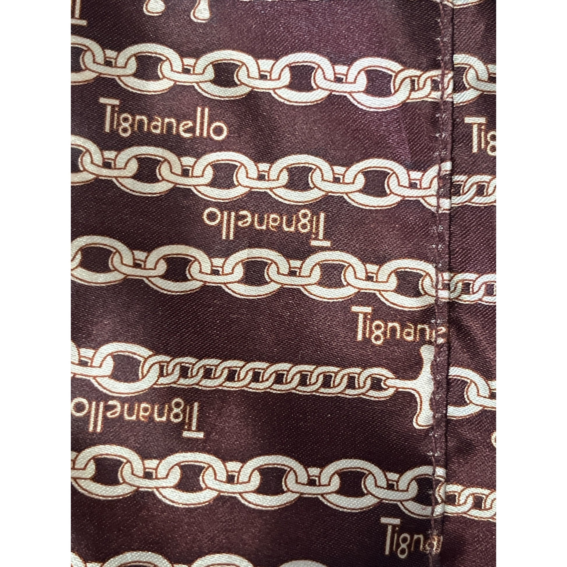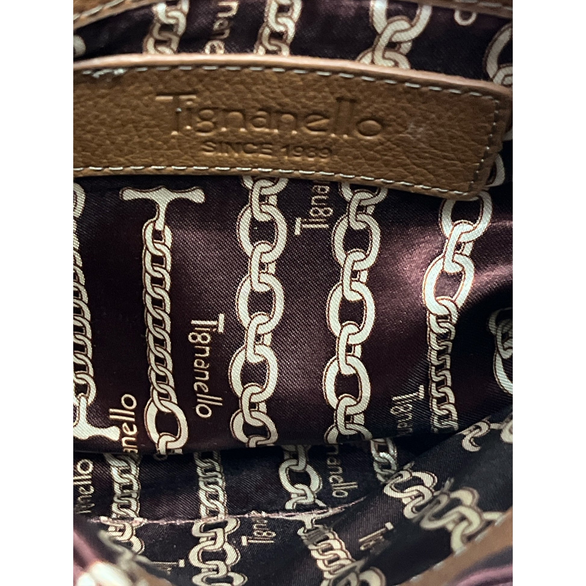 Classic brown leather shoulder bag by Tignanello featuring a compact organizer-style design with multiple exterior and interior pockets. Soft genuine leather exterior with zip-top closure and a **short shoulder strap (not long enough for crossbody wear)**. Interior is fully lined with the signature Tignanello chain-print fabric and includes zip and slip pockets for easy organization. Practical everyday bag with timeless style.
