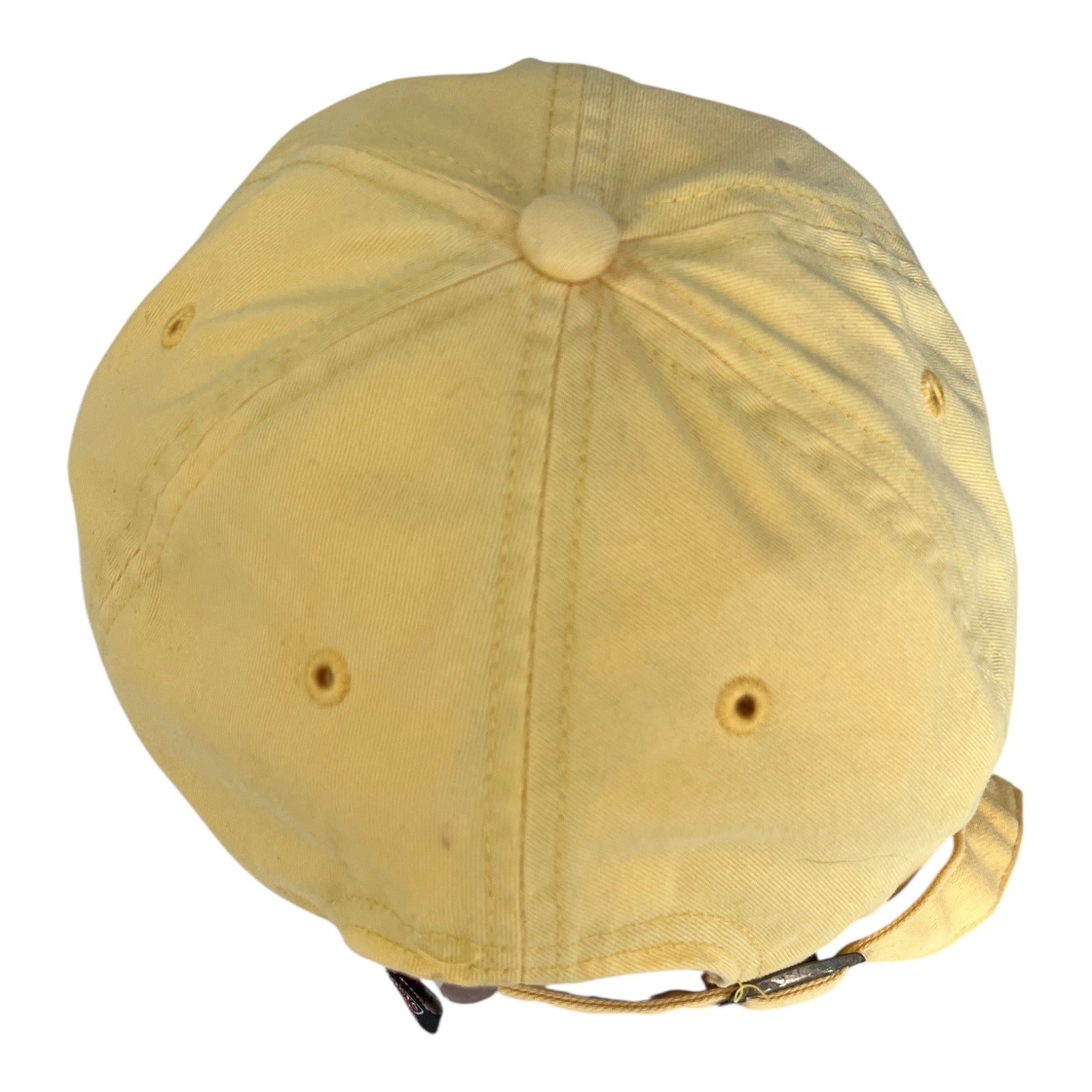 Official 2012 US Open tennis baseball cap by ’47 Brand. Features embroidered tournament logo on the front, adjustable back strap with metal clasp, and breathable eyelets. Bright yellow cotton twill fabric with two faint spots (see photos).
