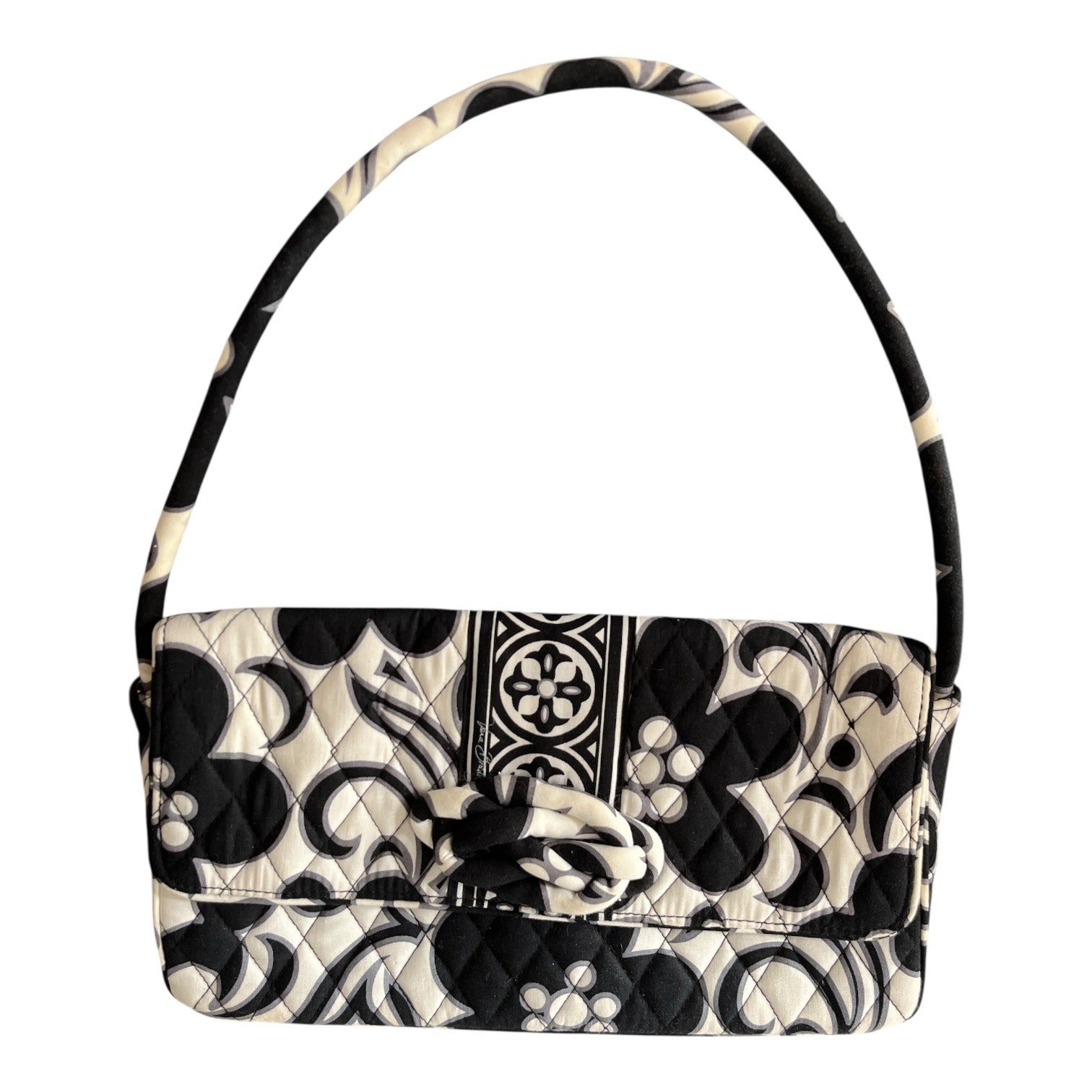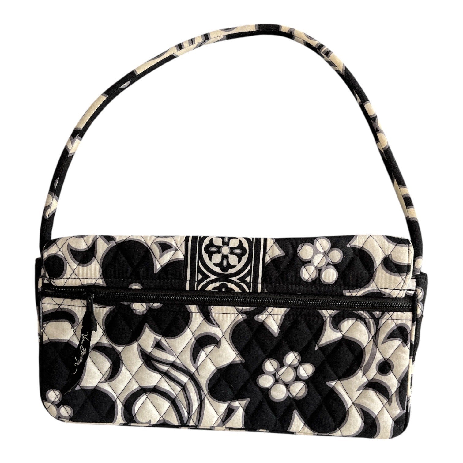 Vera Bradley quilted shoulder bag in the retired Night and Day pattern featuring a bold black and white floral scroll design with gray accents. Structured silhouette with flap front, decorative fabric knot detail, and secure magnetic snap closure. Interior includes coordinating printed lining with zipper pocket for organization. A classic mid-2000s Vera Bradley style that is lightweight yet roomy enough for everyday essentials.