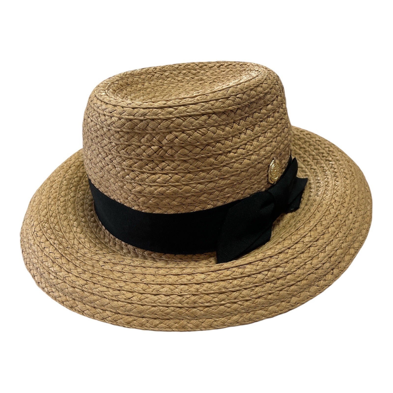Classic Vince Camuto woven straw hat featuring a structured boater silhouette with a flat crown and medium-wide brim. Designed with a black grosgrain ribbon band and bow, accented by a small gold-tone Vince Camuto crest medallion. The interior includes an adjustable string for a customized fit, making it as practical as it is stylish. A chic summer accessory that pairs perfectly with dresses, resort wear, or casual outfits.