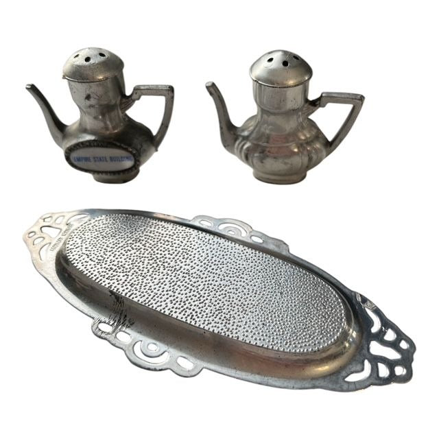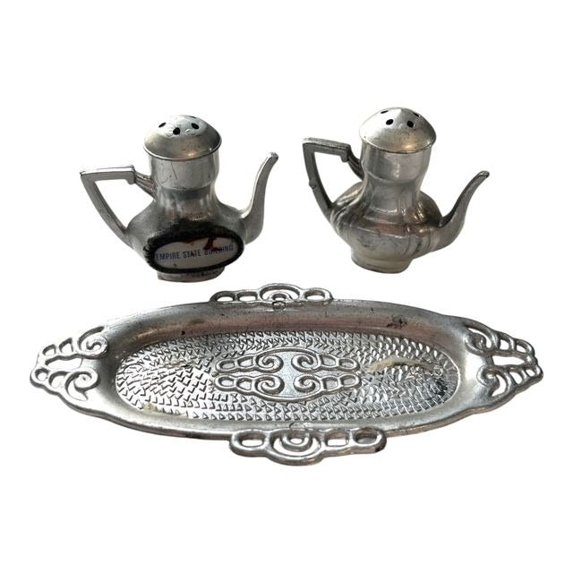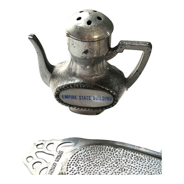 Charming vintage collectible lot featuring a 1960s bridal doll, miniature souvenir set from the Empire State Building, and handmade crocheted doll accessories. The bride doll wears a delicate lace gown with veil and soft facial detailing, while the metal souvenir pieces feature teapot-shaped salt and pepper shakers with an ornate tray. The crocheted outfits and baskets add a sweet handmade touch for display or doll styling. Great mixed vintage bundle for collectors, display, or prop use.