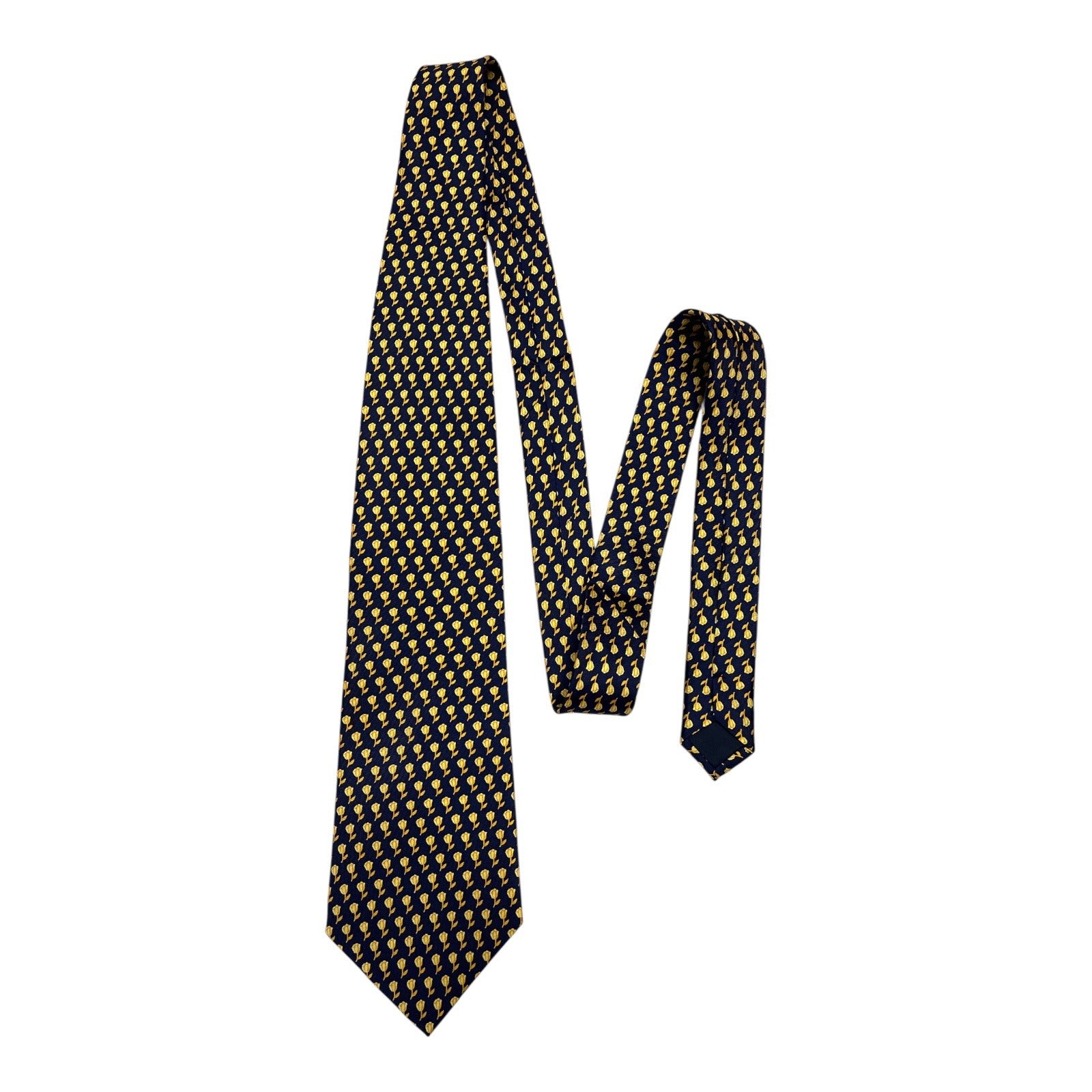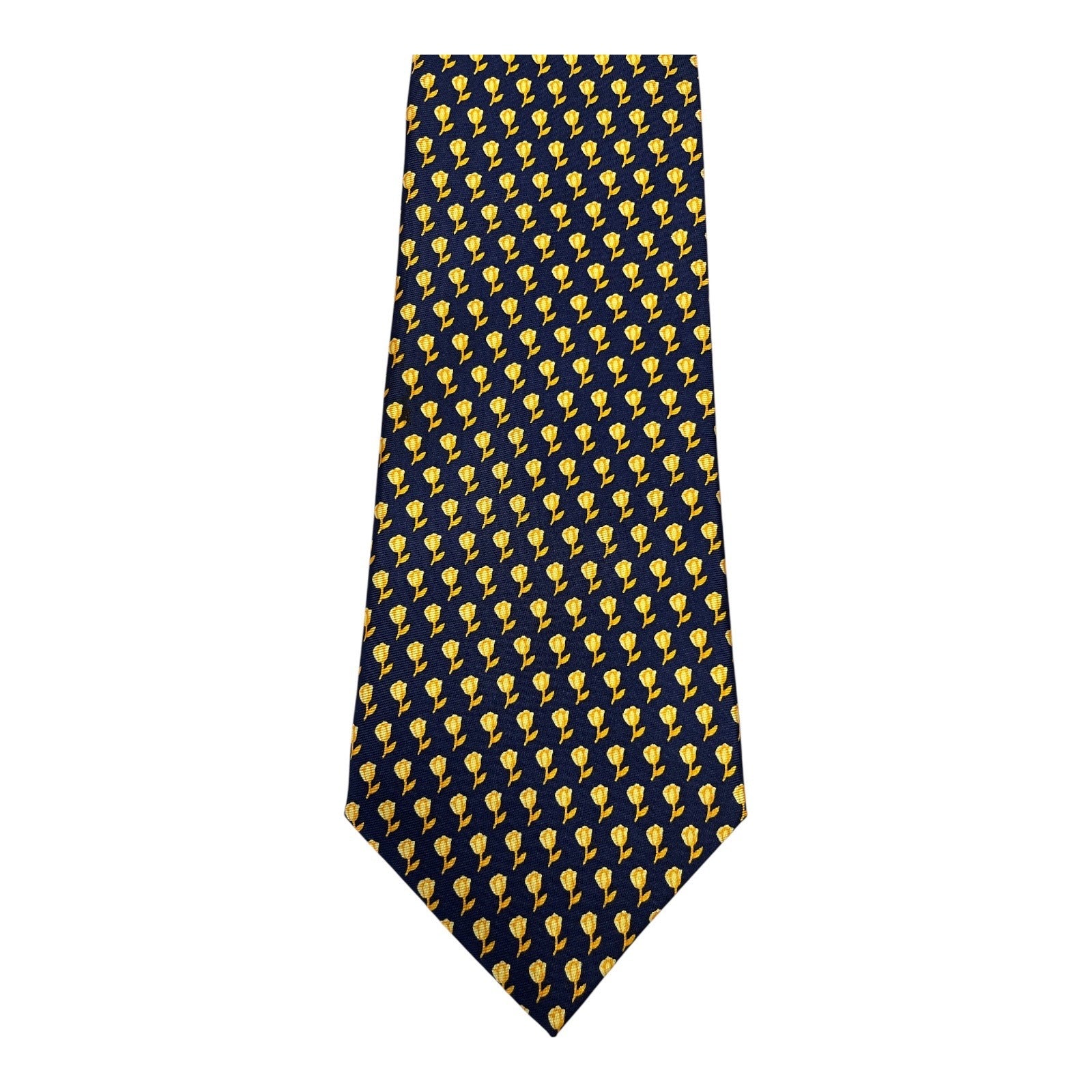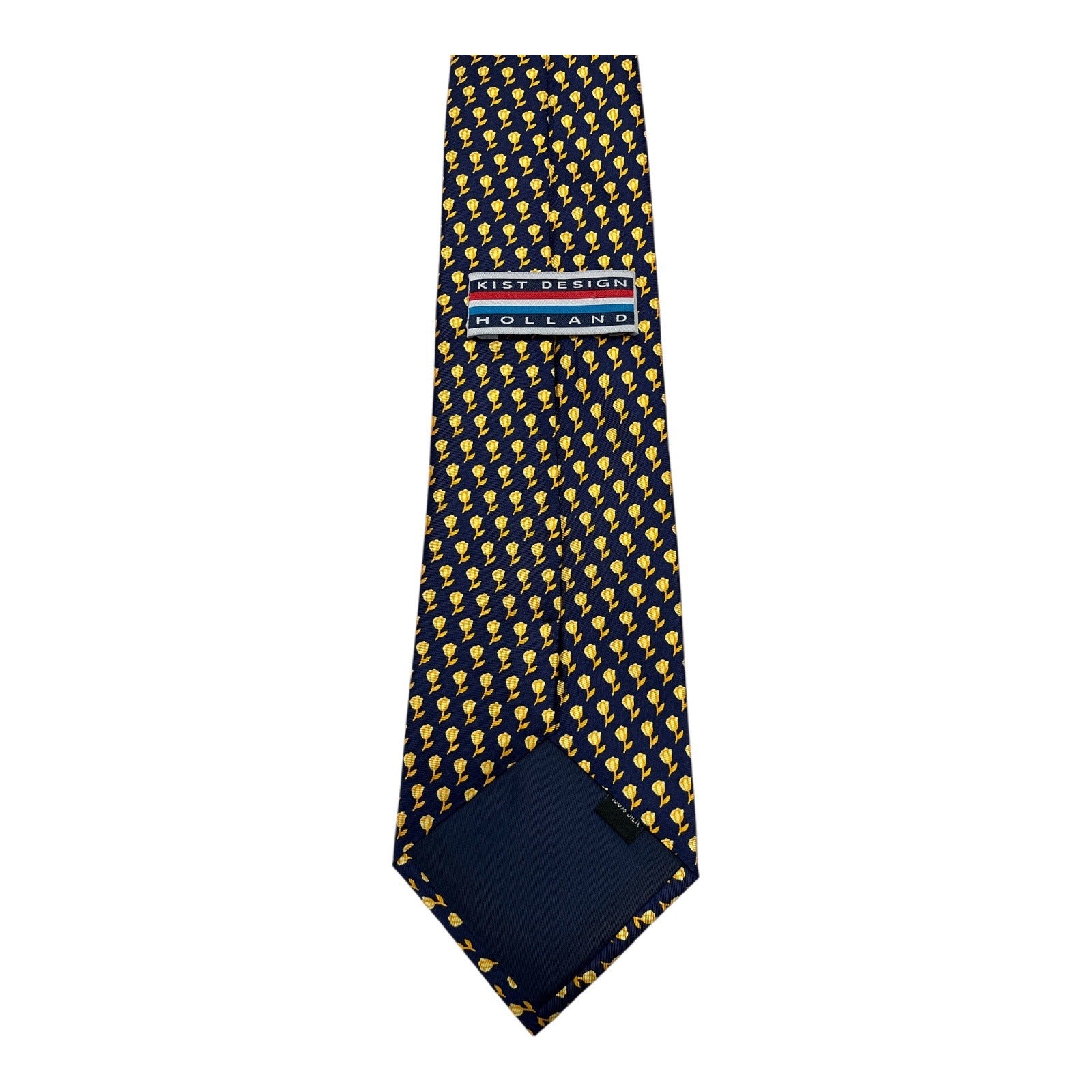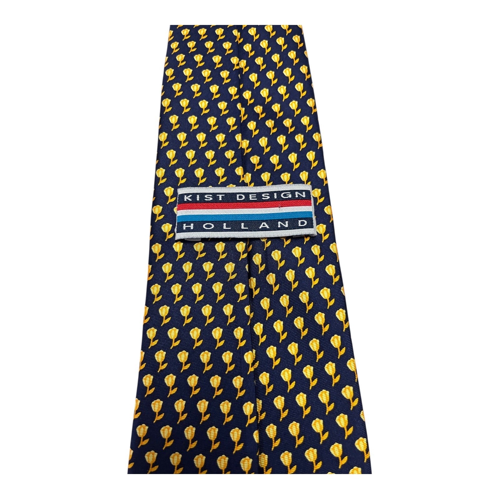 Add a touch of Dutch charm to your wardrobe with this vintage Kist Design tie from Holland. Featuring a repeating yellow tulip pattern on a rich navy background, this piece combines classic European craftsmanship with bold, playful style.