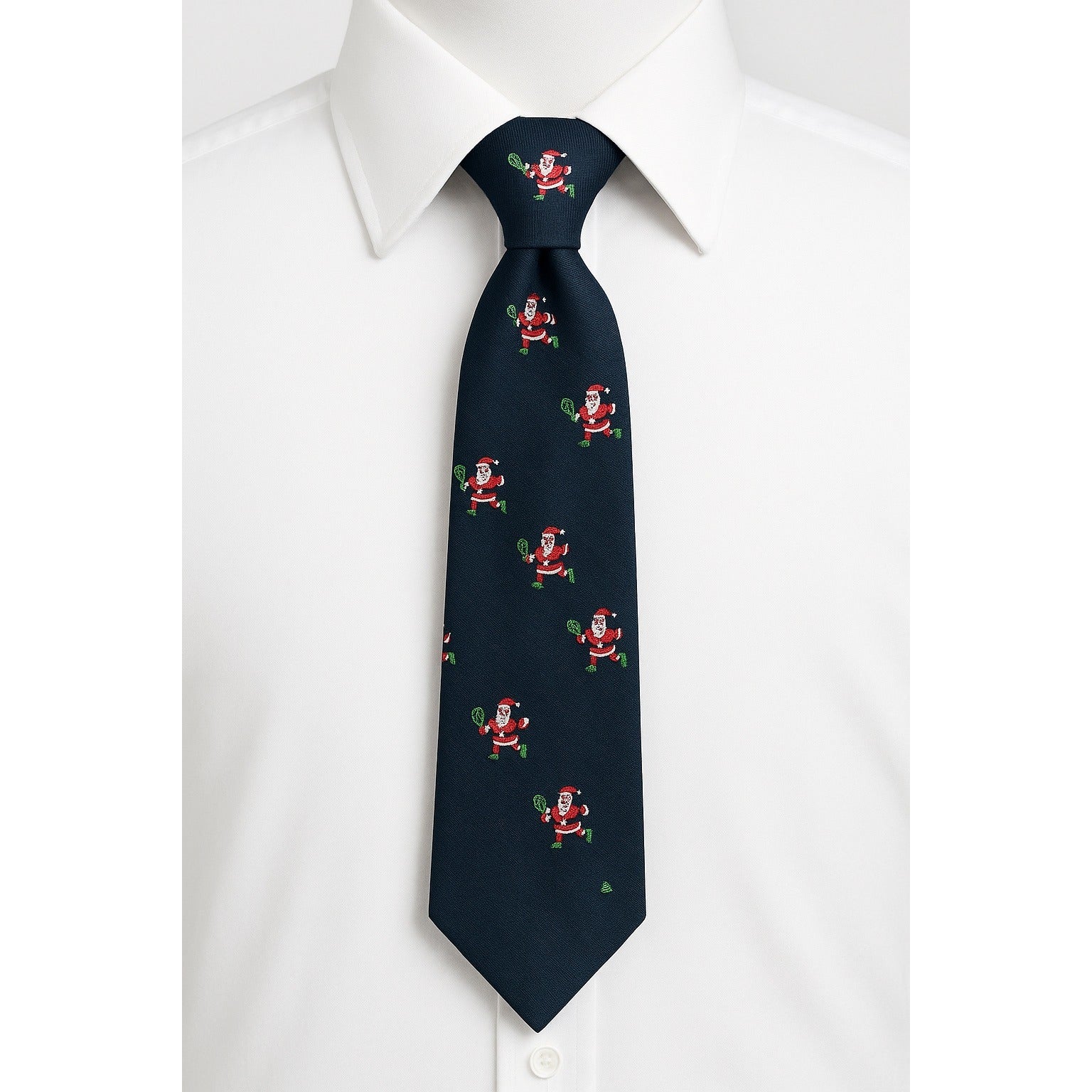 Fun vintage 1990s necktie by Cape Cod Neckwear featuring Santa Claus with a tennis racket. Perfect holiday accessory for Christmas parties, collectors, or anyone who loves novelty sports ties. Made in the USA from a polyester and silk blend.