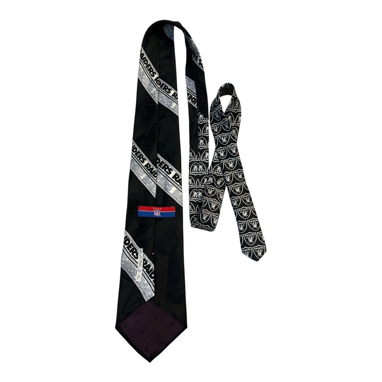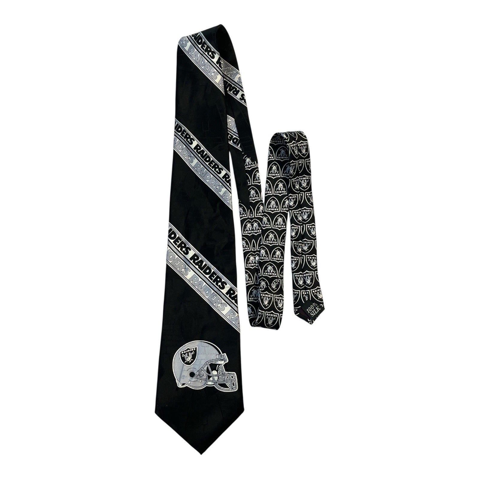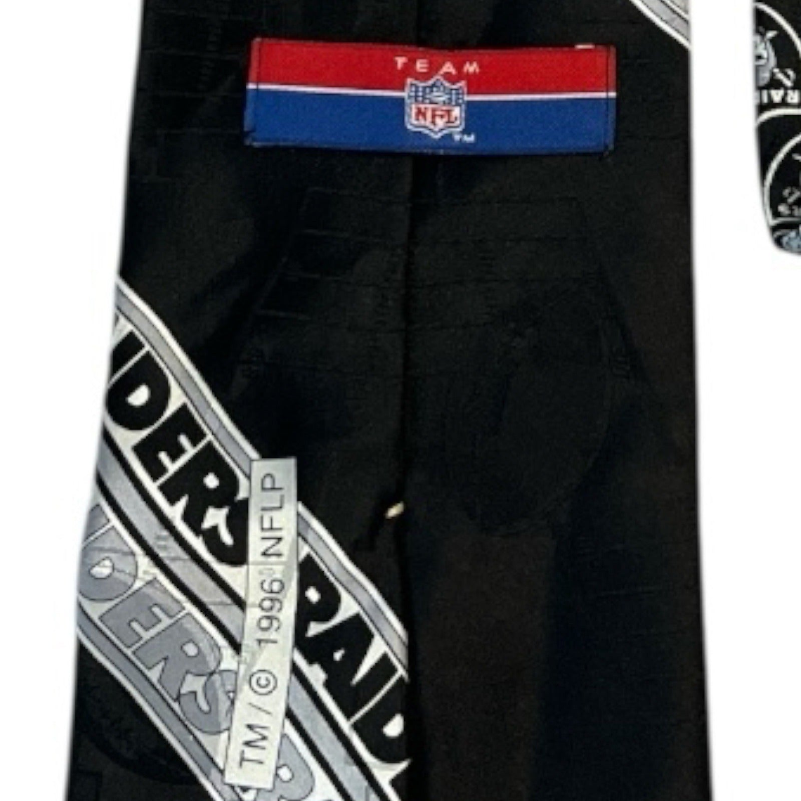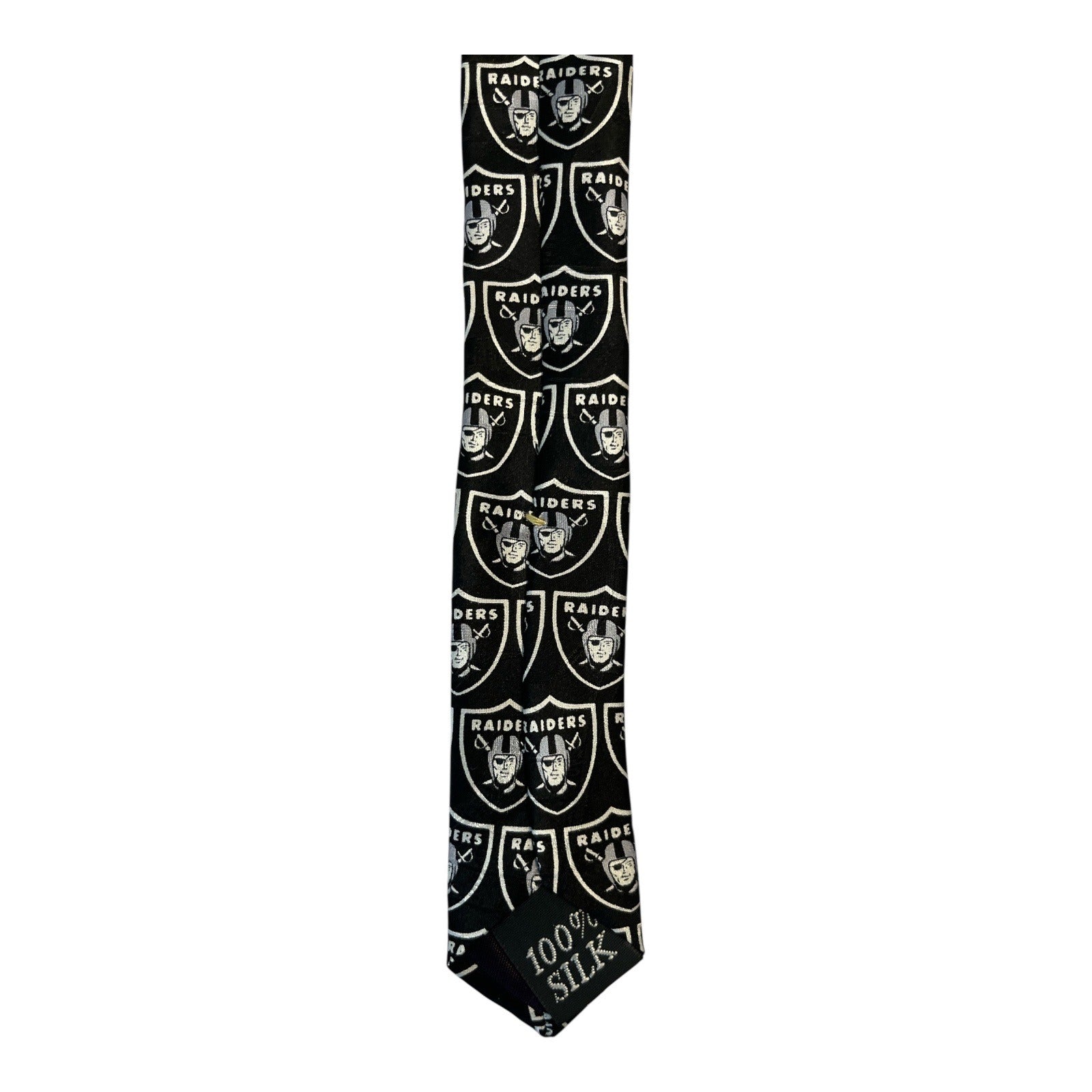 Show your team pride in style with this officially licensed vintage Raiders necktie from 1996. Made of 100% silk, the design features bold diagonal “RAIDERS” stripes and a large silver football helmet on the front, with an all-over Raiders logo pattern on the reverse. A must-have piece for fans, collectors, or retro sportswear lovers.