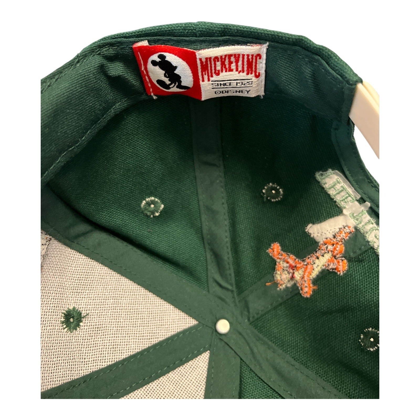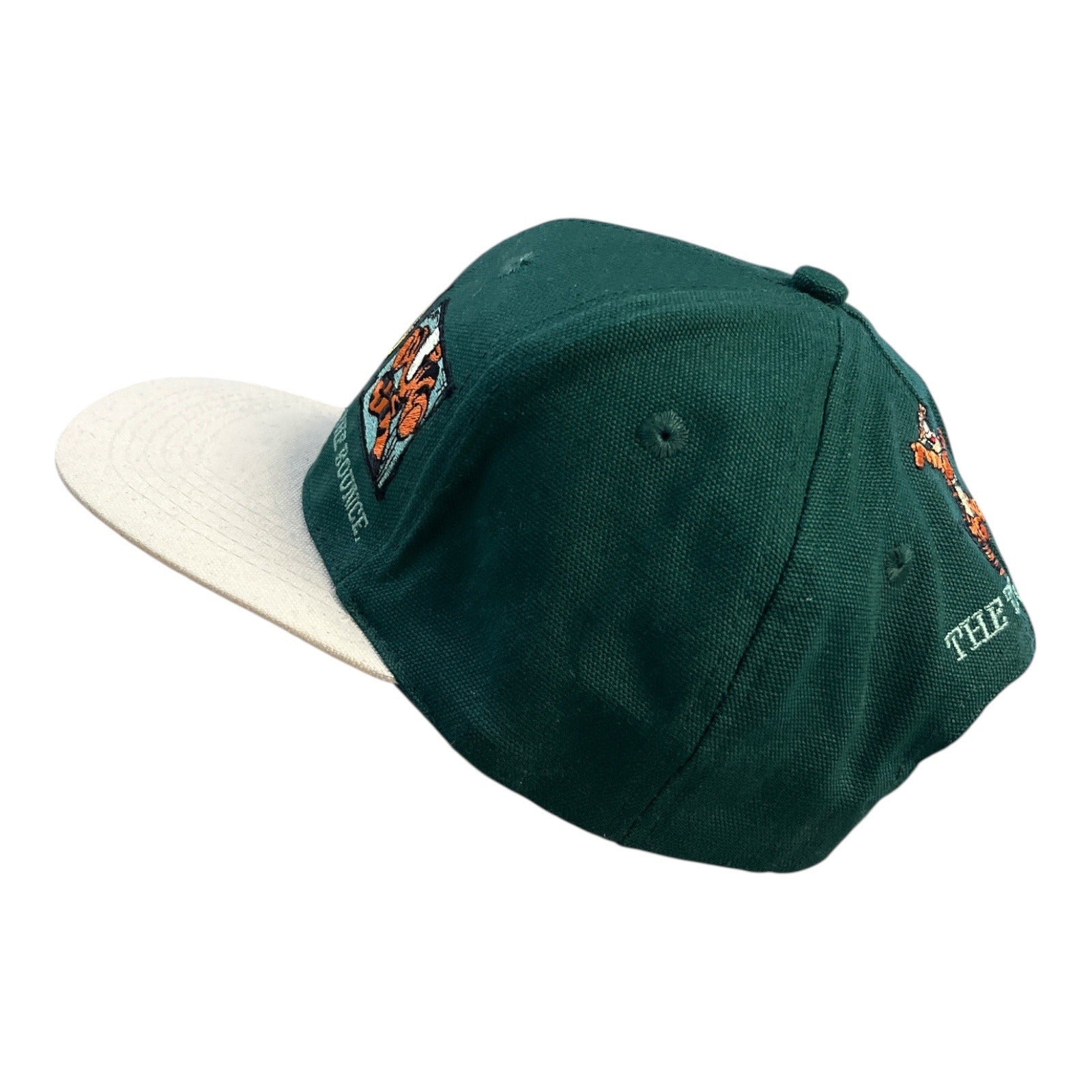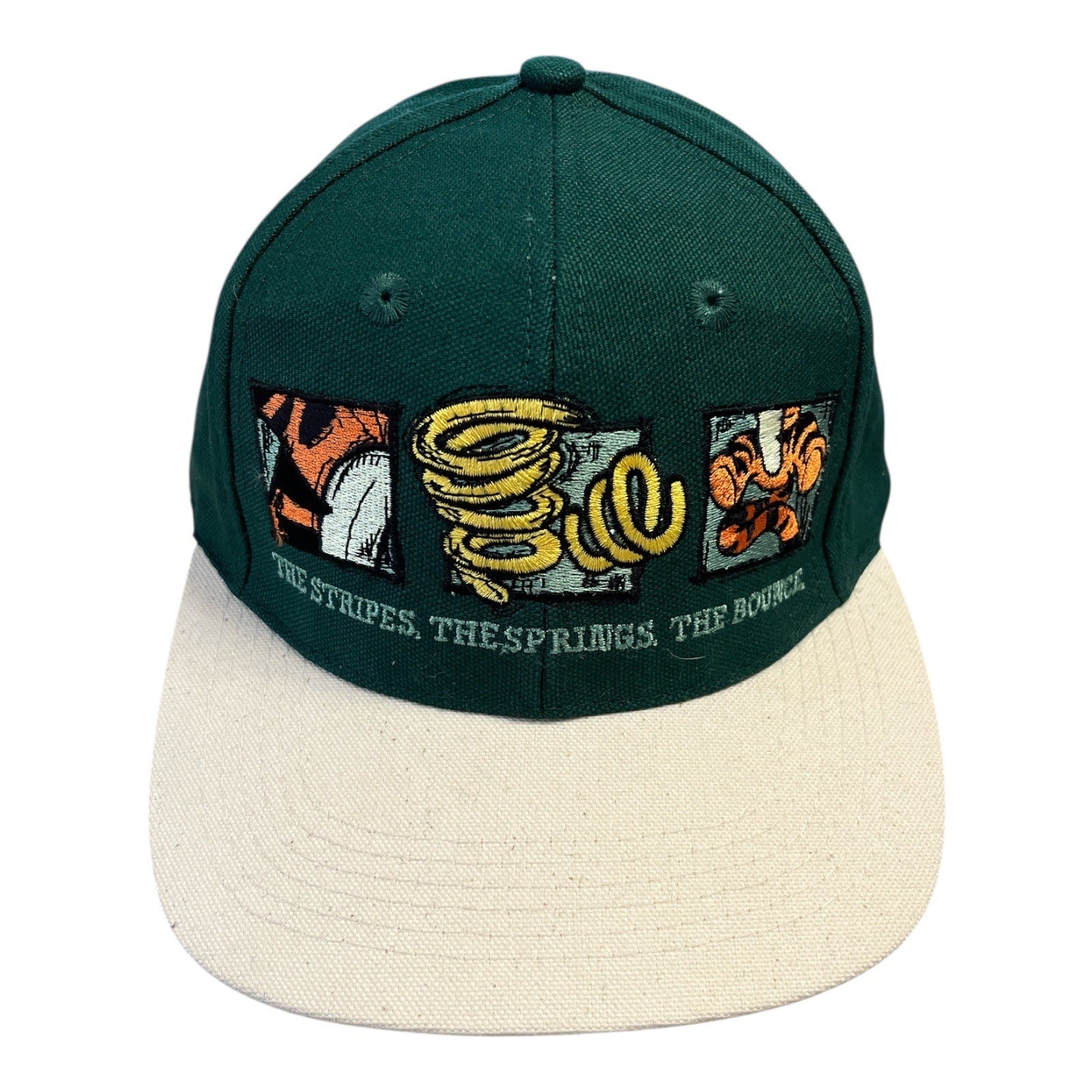 Add some retro Disney charm to your wardrobe with this vintage **Tigger snapback hat** by Mickey, Inc. Featuring vibrant embroidered panels with the text "The Stripes, The Springs, The Bounce," this forest green and off-white cap highlights the playful spirit of Tigger from *Winnie the Pooh*. A standout collectible from the late 1980s to early 1990s.