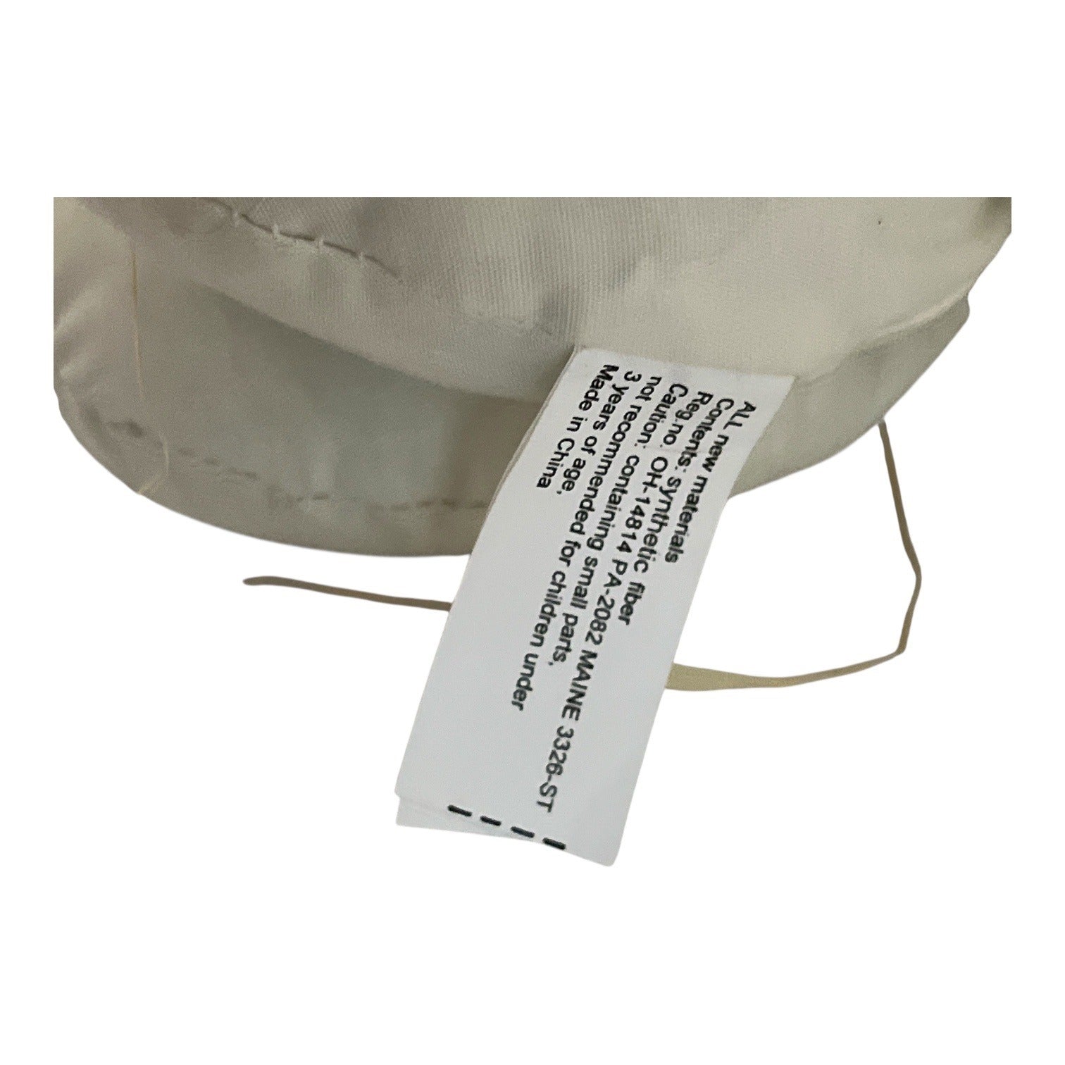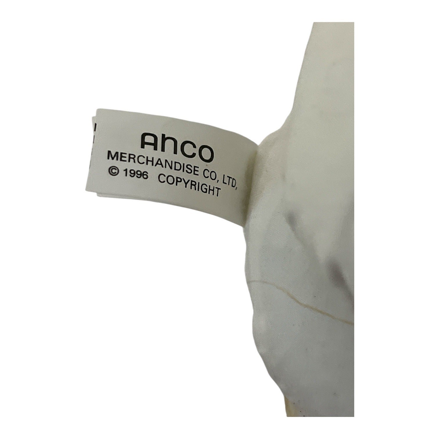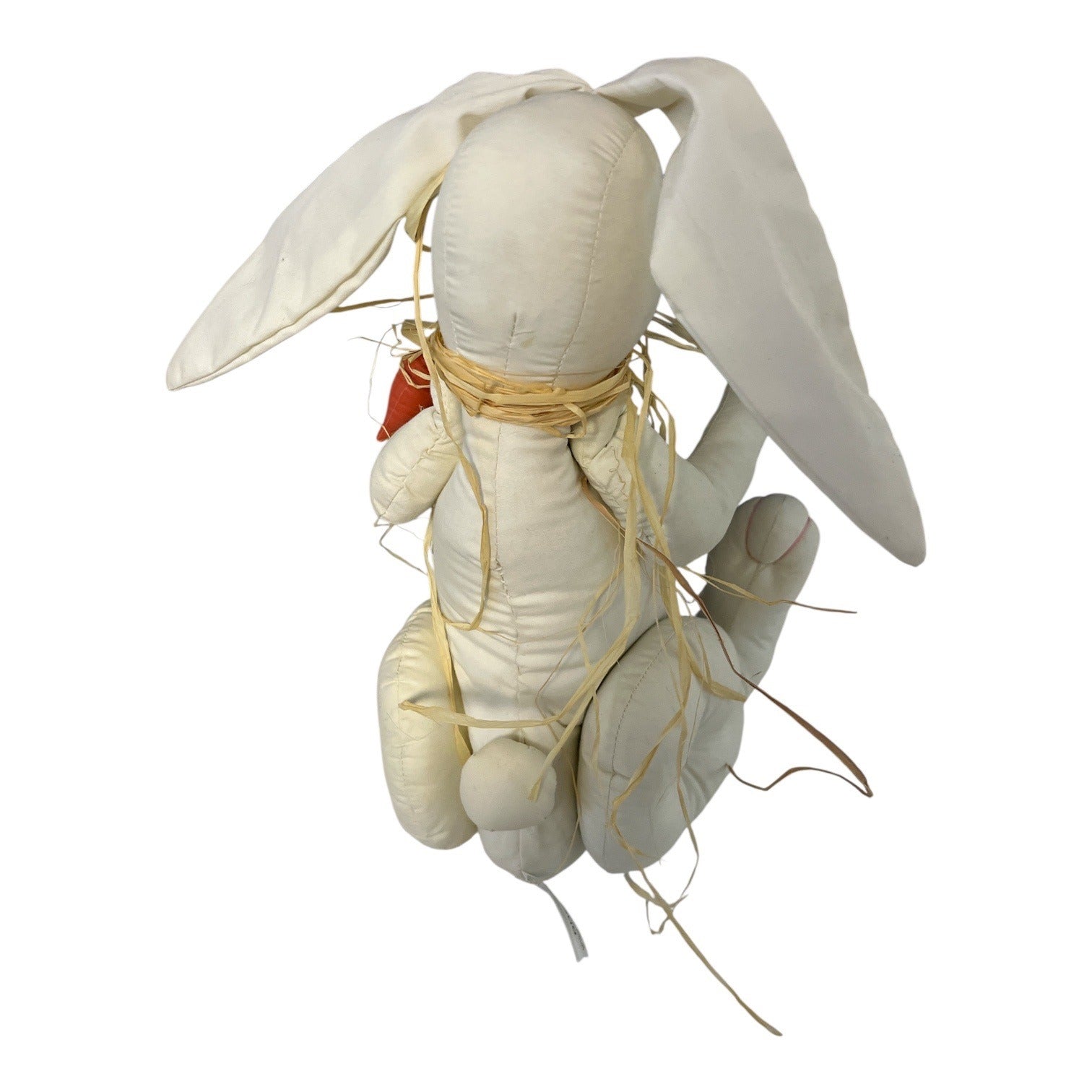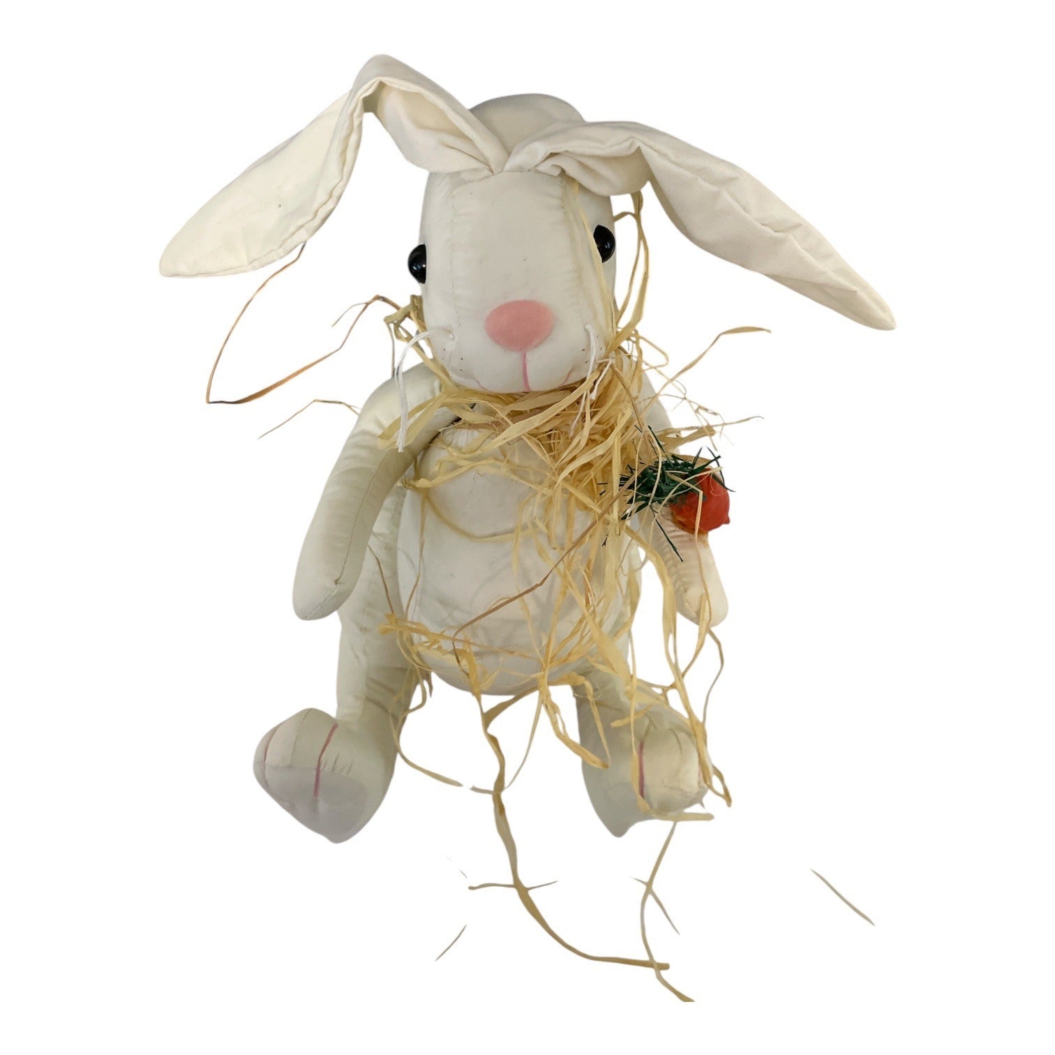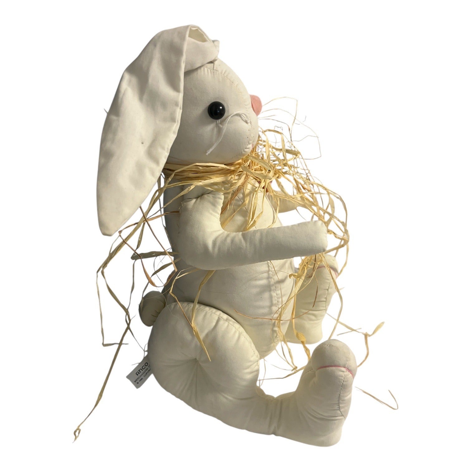 Charming vintage plush bunny made by Ahco Merchandise Co. in 1996. This soft cream rabbit features floppy ears, a pink stitched nose, black button eyes, raffia straw collar, and a small attached carrot accent. Weighted bottom helps it sit upright, making it perfect for Easter décor, nursery display, or vintage plush collectors. 15"