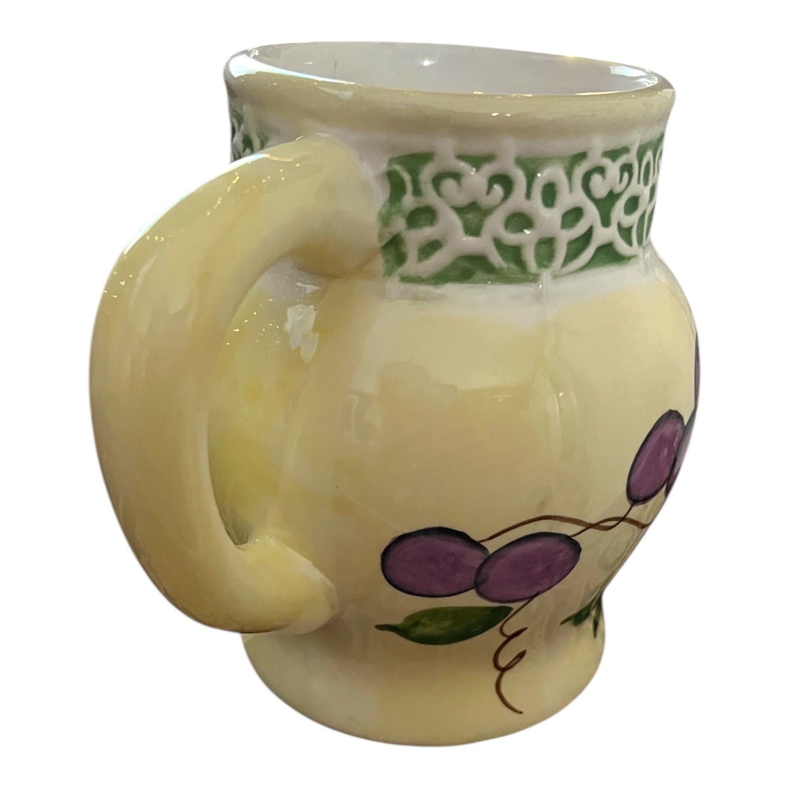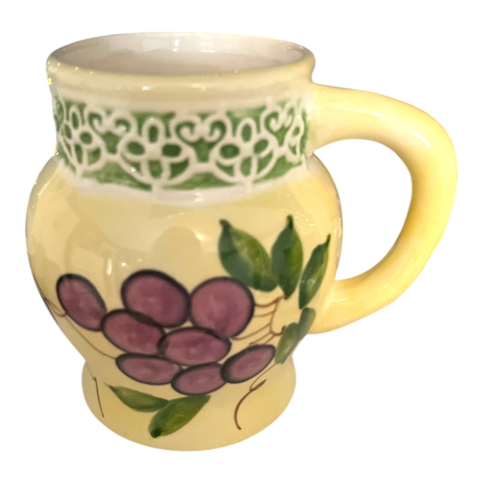 This vintage Alco ceramic mug features a vibrant yellow base with a decorative green band adorned with intricate white patterns. The body of the mug is beautifully hand-painted with a cluster of purple grapes and green leaves, adding a touch of rustic elegance.