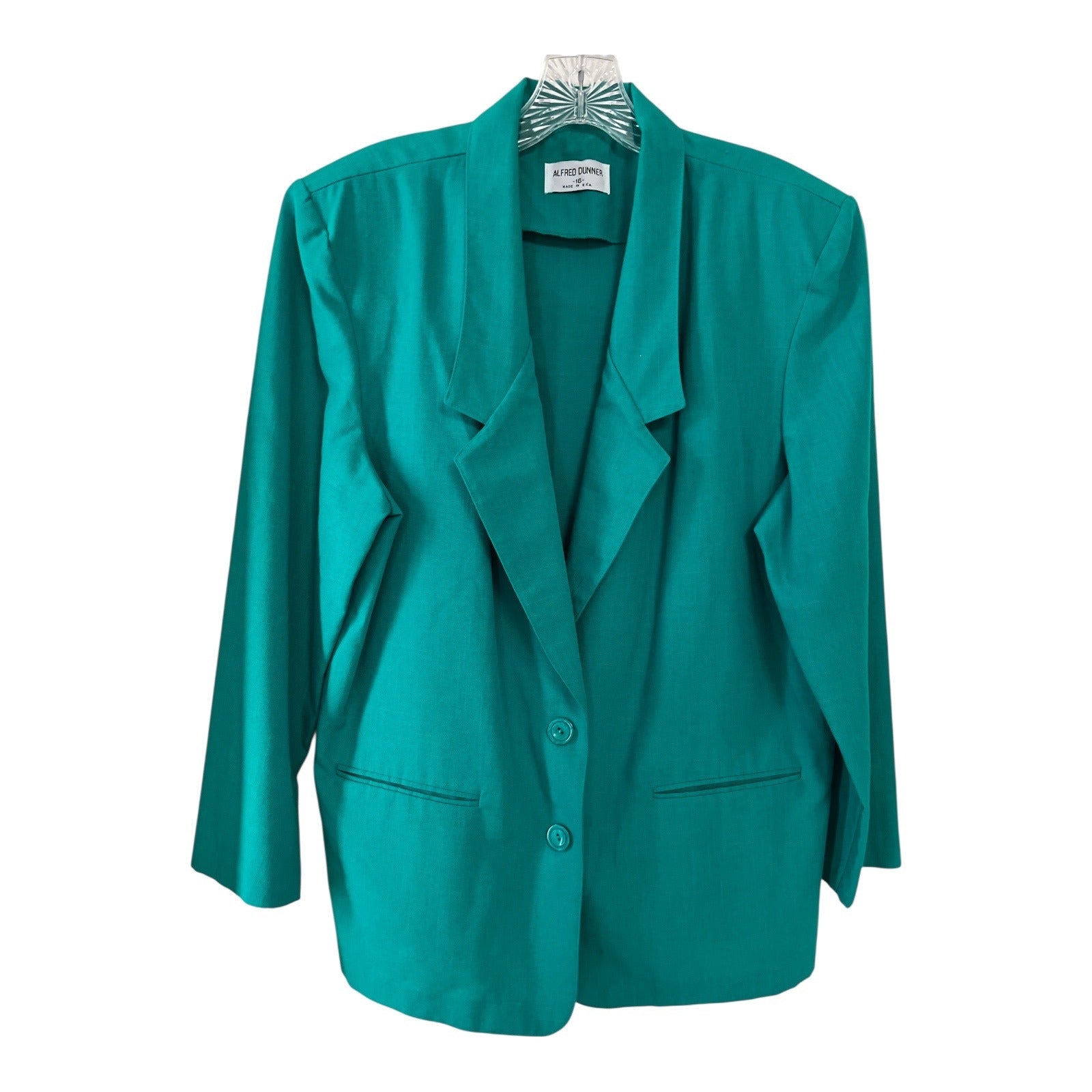 Classic vintage Alfred Dunner women’s blazer in a vibrant teal color. This structured jacket features a notched lapel, two-button front, and lightly padded shoulders for a timeless, polished look. Made in the USA, this piece reflects quality mid-century tailoring and is ideal for layering over blouses or dresses.