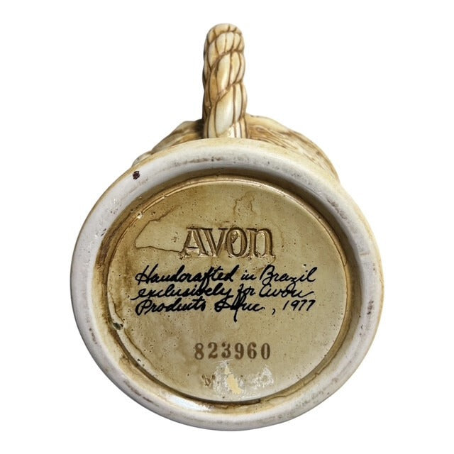 This collectible Avon beer stein features a detailed nautical design with ships, coastal buildings, and rope-style handle. Crafted in 1977 in Brazil exclusively for Avon Products, it includes a hinged pewter lid with ornate detailing. A great piece for collectors of vintage steins, Avon memorabilia, or maritime décor.