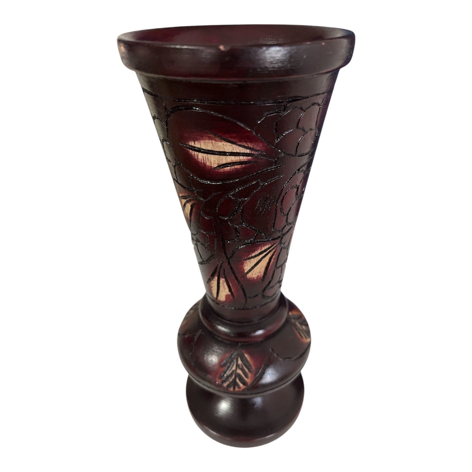 Bring a touch of bohemian artistry to your space with this vintage hand-carved wooden vase. Standing 10 inches tall, this decorative piece showcases a tribal-inspired leaf motif etched into richly stained wood. The warm reddish-brown tone, flared top, and pedestal base give it both character and presence, making it a perfect accent for eclectic, global, or boho-inspired interiors.