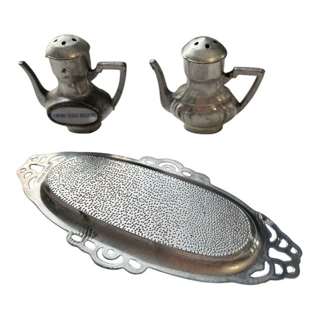 - Condition: Good – gently used, with some wear on the label that reads "Empire State Building" on one side of the teapot-shaped shaker