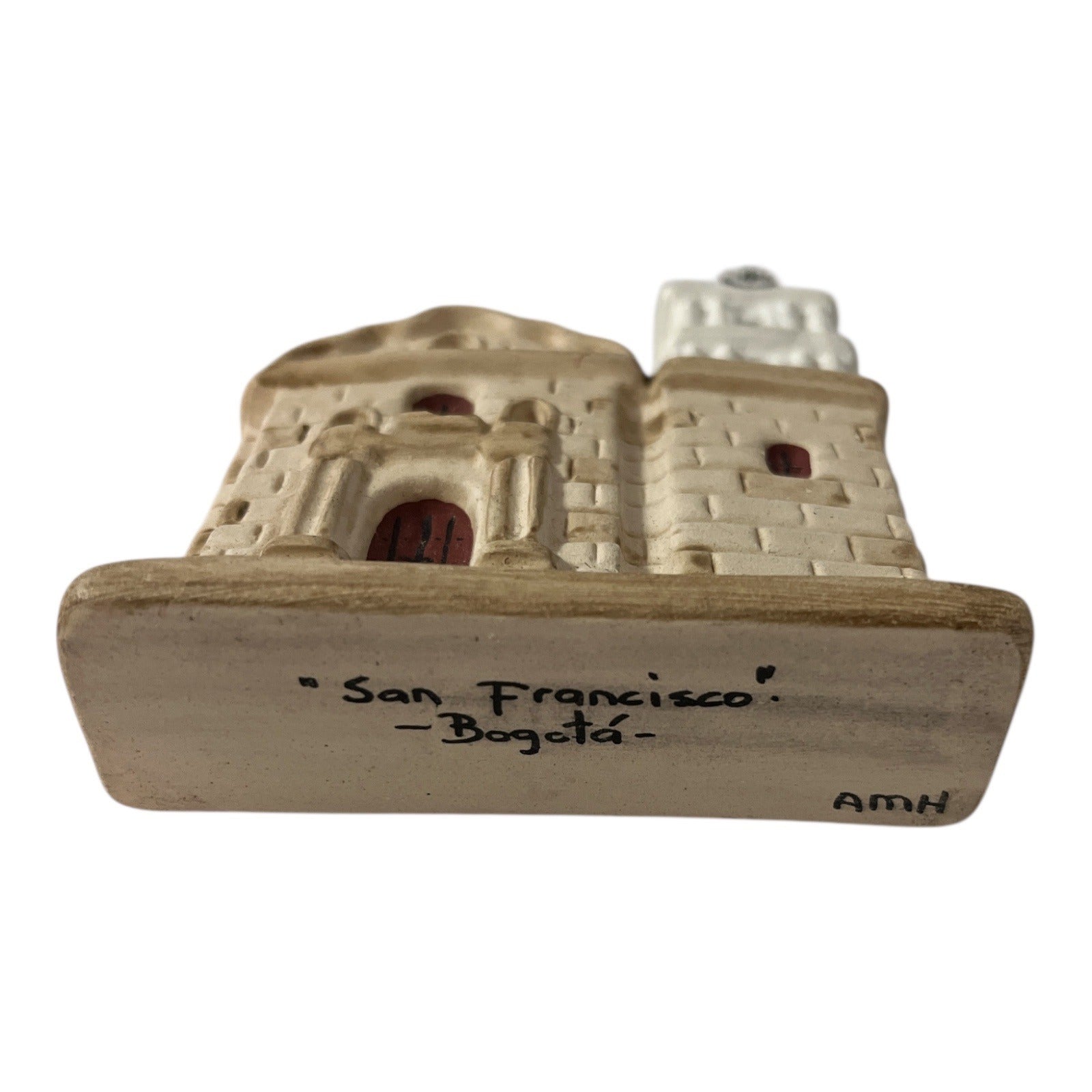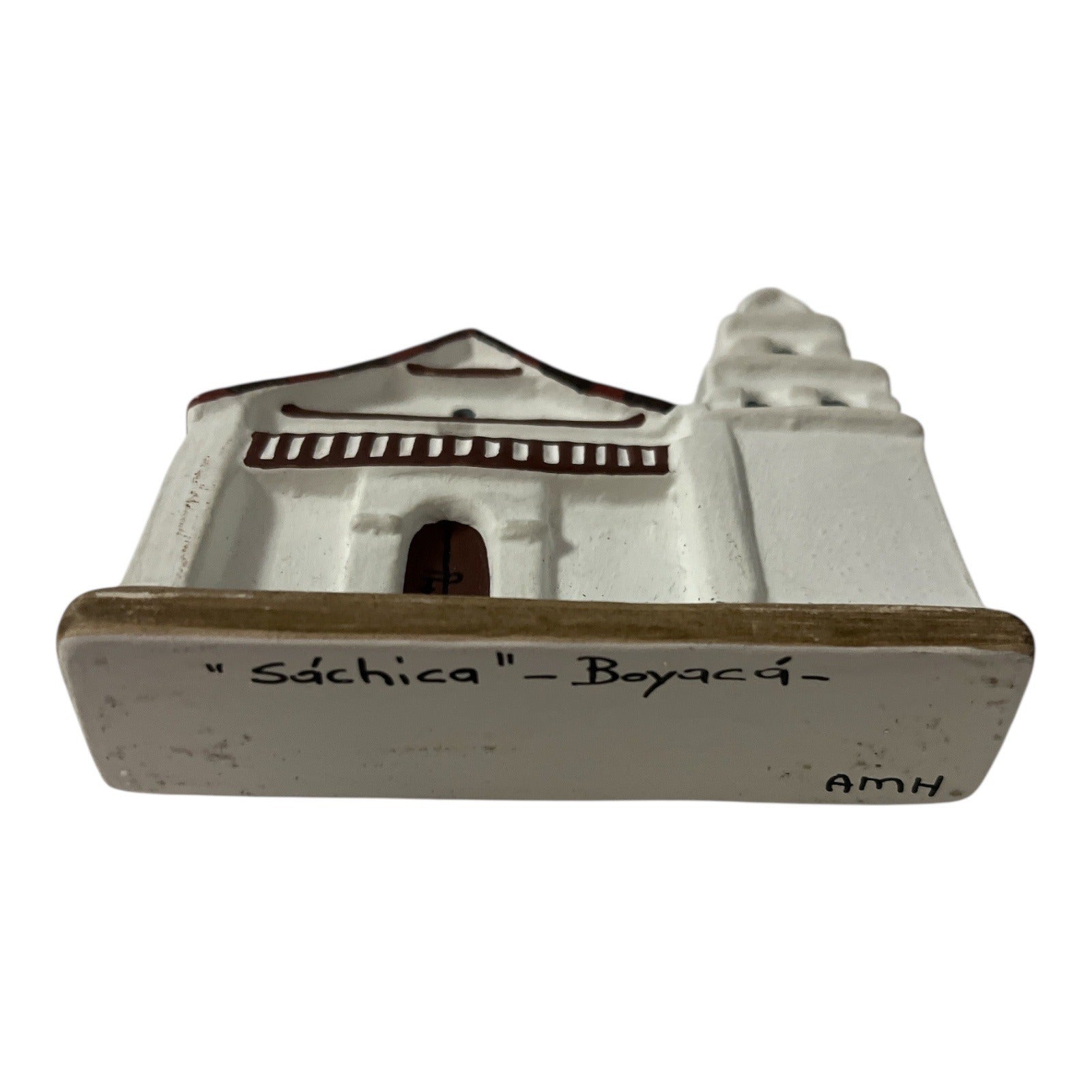 Set of three hand-painted ceramic miniature buildings depicting historic Colombian mission churches. Each piece is individually labeled on the base with the location name and signed “AMH.” The set includes **Sáchica**, **Bogotá** (San Francisco), and a third coordinating mission-style structure. These small architectural miniatures are ideal for shelf displays, travel collections, or Latin American folk art décor.