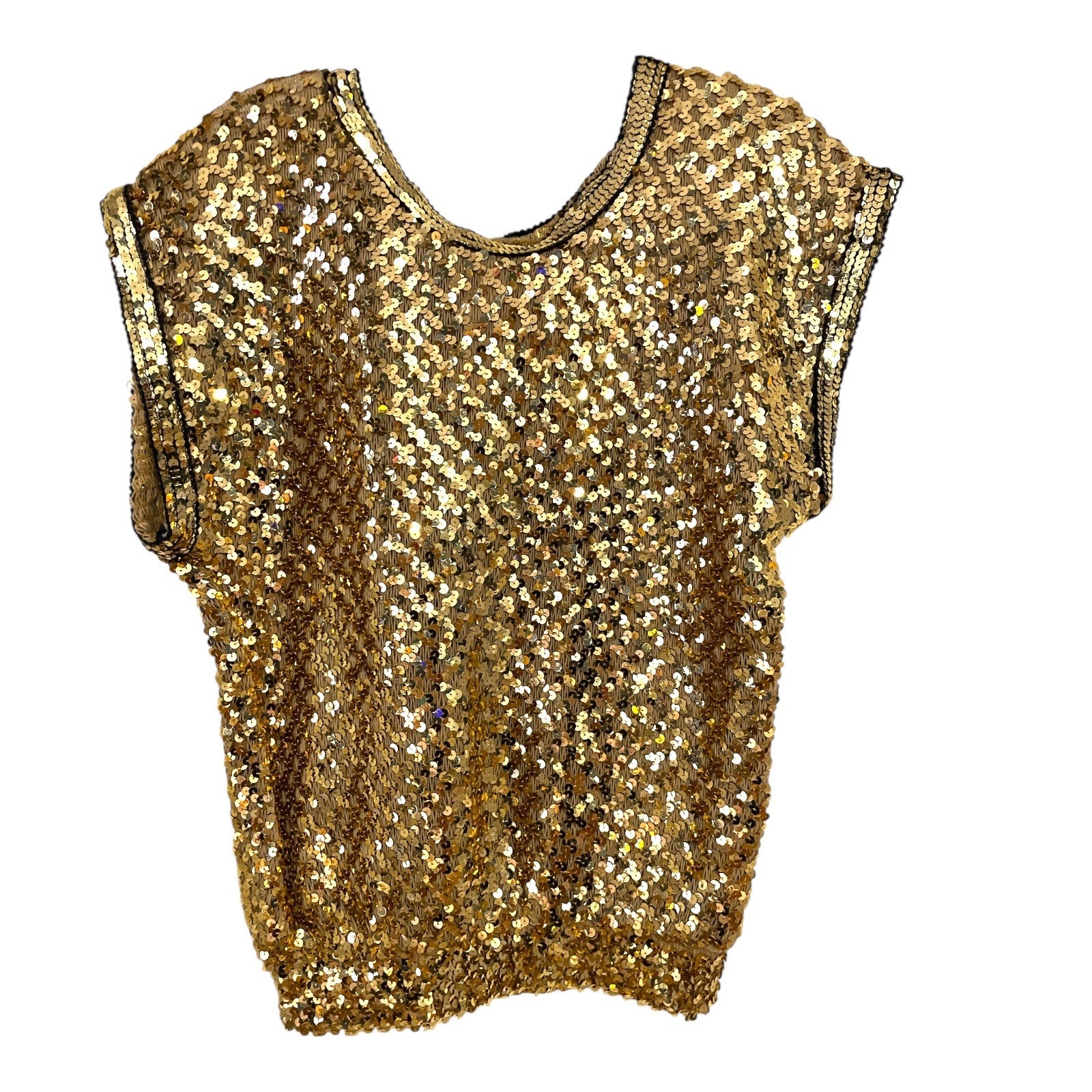 Shine bright in this vintage **Creations III** sequin top, a stunning statement piece from the 1980s. Made in the USA, it’s fully covered in shimmering gold sequins with black trim along the neckline and armholes.